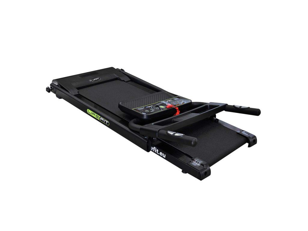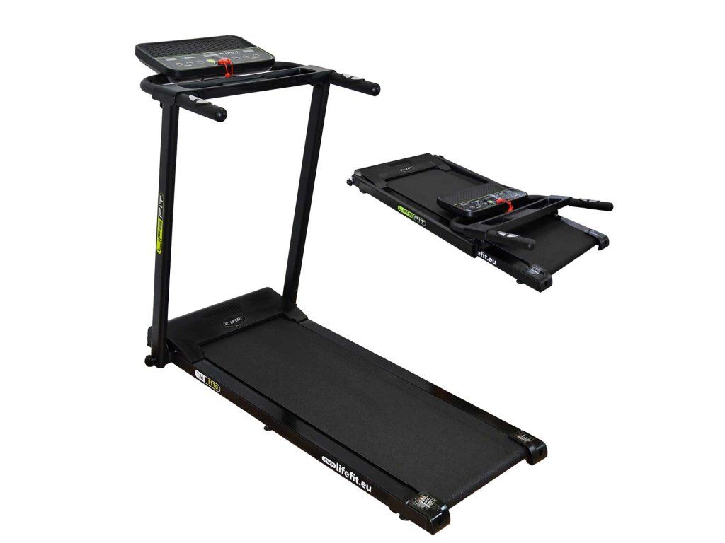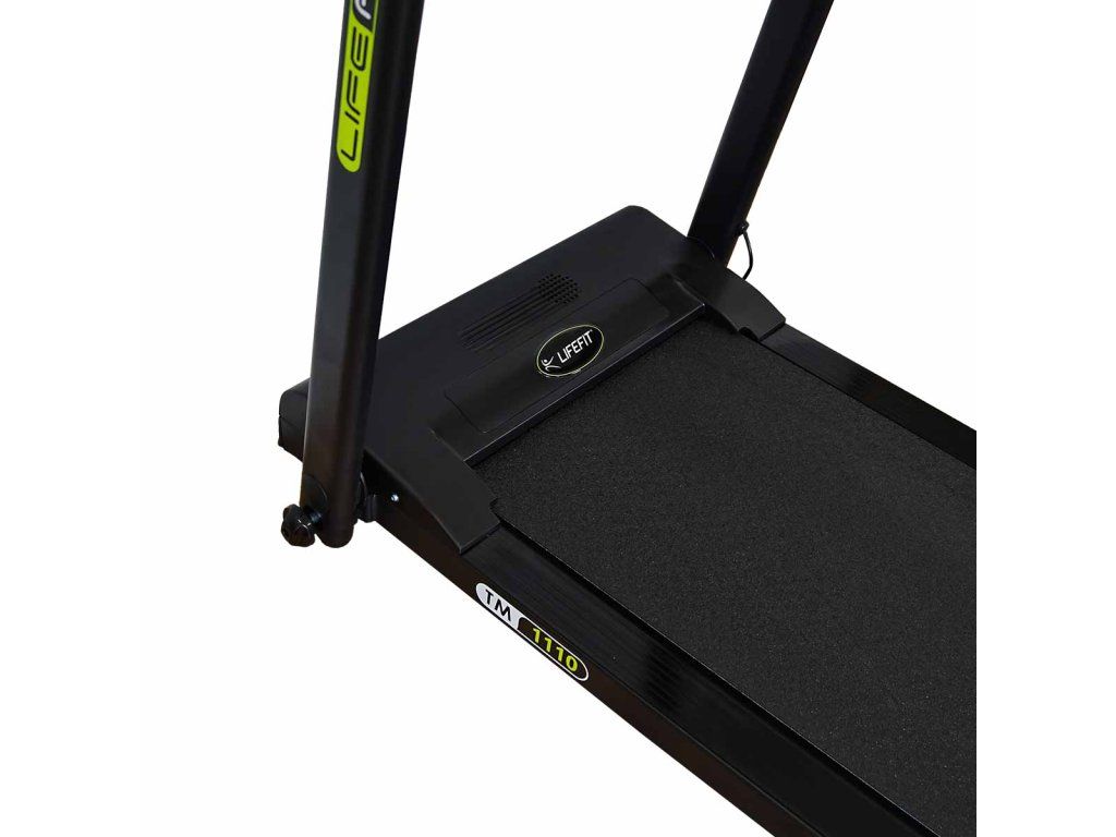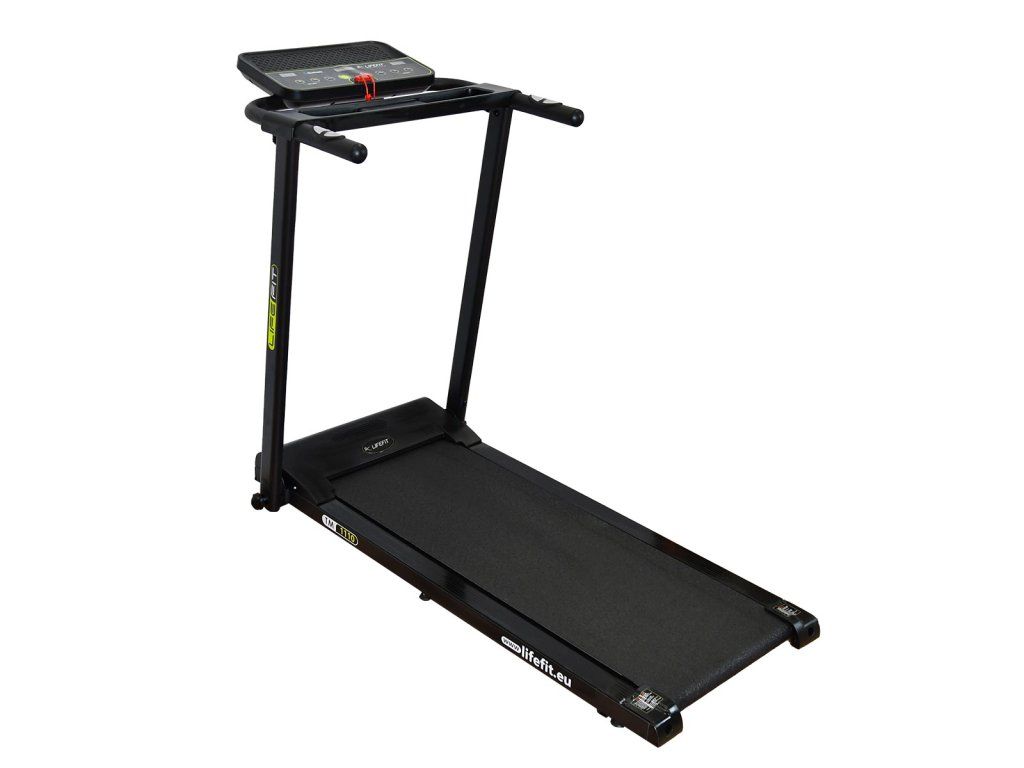 Motorový běžecký pás LIFEFIT TM1110 - motor o výkonu max. 1,2 HP (continuity 0,6 HP) - rychlost 1-10 km/h - bez možnosti náklonu - pás s běžeckou plochou 100x38 cm - displej zobrazující čas, rychlost, vzdálenost, kalorie, tepovou frekvenci - 12 přednastavených programů, BODYFAT test - možnost Bluetooth propojení (aplikace SPAX) - snímač tepové frekvence na rukojetích - kolečka (válečky) umožňují snadnou manipulaci - bezpečnostní brzda - 2x odkládací plocha (např.na pití), stojan na tablet - max. nosnost 90 kg - rozměry: 133x61x104 cm - rozměry ve sklopeném stavu: 133x61x60 cm - hmotnost pásu: 25 kgDoplňkové parametry