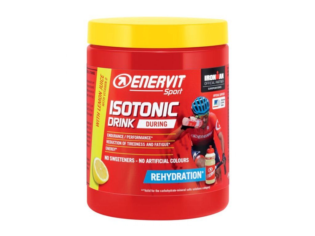 Rozpuštěním ENERVIT Isotonic Drink ve vodě získáte energetický iontový nápoj pro vytrvalce, který přispívá k udržení výkonnosti a zvyšuje vstřebávání vody během fyzického výkonu. Je užitečný především v případě nadměrného pocení v důsledku jakékoliv intenzivní fyzické aktivity a při sportu, ať již amatérském či profesionálním. *ENERVIT Isotonic Drink znáte pod dřívějším názvem ENERVIT G Sport. Doporučené dávkování: nápoj pijte průběžně BĚHEM výkonu, cca každých 15 minut 100 až 150 ml do 500 ml vody nasypte 30 g prášku pro hypotonickou hustotu nápoje do 500 ml vody nasypte 15 g prášku Doporučujeme Nic nezkazíte, když nápoj zbylý z tréninku dopijete i po skončení výkonu, ale ještě před regeneračním nápojem. U výkonů, kde se nadměrně potíte, doporučujeme pít výhradně hypotonicky ředěný nápoj. Tabulka nutričních hodnot: 100 g pomeranč citron Energetická hodnota 333 kcal / 1415 kJ 337 kcal / 1432 kJ Tuky (g) 0 0 Sacharidy (g) 83 84 - z toho cukry (g) 72 74 Bílkoviny (g) 0 0 Sůl (g) 2,00 2,00 Sodík (mg) 800 800 Draslík (mg) 150 150 Chlor (mg) 492 492 Hořčík (mg) 45 45 Vitamín C (mg) 101,6 101,6 Vitamín B3 (mg) 20,3 20,3 Vitamín B5 (mg) 7,6 7,6 Vitamín B2 (mg) 1,8 1,8 Vitamín B1 (mg) 1,4 1 Vitamin D (µg) 6,4 6,4 Osmolalita 280 mOsm/kg 270 mOsm/kg 15 g (1 odměrka) pomeranč citron Energetická hodnota 50 kcal / 212 kJ 50,5 kcal / 214,5 kJ Tuky (g) 0 0 Sacharidy (g) 12,5 12,5 - z toho cukry (g) 11 11 Bílkoviny (g) 0 0 Sůl (g) 0,30 0,30 Sodík (mg) 120 120 Draslík (mg) 22,5 22,5 Chlor (mg) 73,8 74 Hořčík (mg) 6,75 6,75 Vitamín C (mg) 15,2 15,2 Vitamín B3 (mg) 3,05 3,05 Vitamín B5 (mg) 1,15 1,15 Vitamín B2 (mg) 0,265 0,265 Vitamín B1 (mg) 0,21 0,15 Vitamin D (µg) 0,95 0,95 Osmolalita 280 mOsm/kg 270 mOsm/kg Složení: Pomeranč: Sacharóza (38 %), dextróza (25 %), fruktóza (12 %), směs maltodextrinů s různým stupněm polymerace (DE2, DE6 a DE19) (8,5 %), glukonát sodný, regulátor kyselosti: kyselina citrónová, rýžový škrob (3 %), aroma, glukonát draselný, chlorid sodný, zahušťovadlo: sodná sůl, citronan hořečnatý, protispékavé činidlo: oxid křemičitý, barvivo: extrakt z papriky, kyselina L-askorbová, nikotinamid, vitamín B5, vitamín B2, vitamín B1, vitamín D. Citrón:Sacharóza (39,5 %), dextróza (24,6 %), fruktóza (12 %), směs maltodextrinů s různým stupněm polymerace (DE2, DE6 a DE19) (7,9 %), glukonát sodný, regulátor kyselosti: kyselina citrónová, rýžový škrob (3 %), aroma, glukonát draselný, chlorid sodný, zahušťovadlo: karboxymethyl celulóza, uhličitan hořečnatý, protispékavé činidlo: oxid křemičitý, kyselina L-askorbová, barvivo: kurkumin, nikotinamid, vitamín B5, vitamín B2, vitamín B1, vitamín D. Upozornění: Může obsahovat stopy mléka, sóji, vajec. Skladova v suchu a chladnu. Doplněk stravy. Minimální trvanlivost do data na obalu.Doplňkové parametry