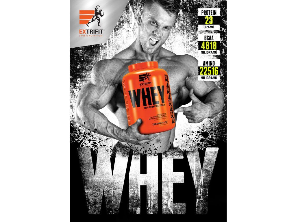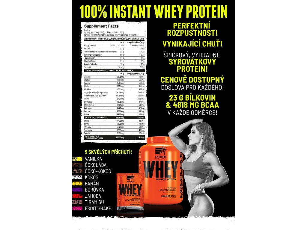 100% Whey Protein od Extrifitu je výborně stravitelný ryzí syrovátkový protein za skvělou cenu. Tento protein je plně instantní, rychle se rozpouští a jeho příprava je mimořádně snadná. Hotový nápoj má velmi příjemnou konzistenci. Díky prvotřídnímu zdroji bílkovin přispívá 100% Whey Protein k růstu svalové hmoty a k jejímu udržení v situacích, kdy je ohrožena katabolizací. V každé dávce se můžete těšit na plných 23 g bílkovin té nejvyšší kvality. Hlavní proteinová složka pochází z ověřeného evropského zdroje. Hlavní přednosti: perfektní rozpustnost výborná stravitelnost jedinečná chuť špičkový, výhradně syrovátkový protein! cenově dostupný doslova pro každého 4818 mg BCAA v každé dávce 23 g bílkovin v každé dávce Doporučené dávkování: rozmixujte obsah 1 odměrky/sáčku (30 g) ve 200 ml vody (množství vody můžete upravit dle vaší chuti) denní dávka = 1 odměrka/sáček (30 g)Tabulka nutričních hodnot: Průměrný obsah energie a živin: 100 g 30 g Energetická hodnota 1625 kJ / 387 kcal 488 kJ / 116 kcal Tuky 5,3 g 1,6 g - z toho nasycené mastné kyseliny 3,4 g 1,0 g Sacharidy 9,0 g 2,7 g - z toho cukry 4,7 g 1,4 g Vláknina 1,7 g 0,5 g Bílkoviny 75 g 23 g Sůl 0,27 g 0,08 g - pro příchuť slaný karamel 2,10 g 0,63 g Typický profil aminokyselin: 100 g 30 g L-Alanin 3678 mg 1103 mg L-Arginin 1801 mg 540 mg L-Cystein 1727 mg 518 mg Glycin 1276 mg 383 mg L-Histidin 1351 mg 405 mg Kyselina asparagová 8105 mg 2432 mg Kyselina glutamová 13359 mg 4008 mg L-Lysin 6829 mg 2049 mg L-Methionin 1576 mg 473 mg L-Fenylalanin 2327 mg 698 mg L-Prolin 4428 mg 1329 mg L-Serin 3678 mg 1103 mg L-Threonin 5329 mg 1599 mg L-Tryptofan 1351 mg 405 mg L-Tyrosin 2176 mg 653 mg L-Isoleucin 4428 mg 1329 mg L-Leucin 7806 mg 2342 mg L-Valin 3827 mg 1148 mg BCAA celkem 16 061 mg 4 818 mg Aminokyseliny celkem 75 052 mg 22 516 mg Složení: instantní syrovátkový proteinový koncentrát* (emulgátor: slunečnicový lecitin 0,4 %), káva (pouze příchuť tiramisu), kakao se sníženým obsahem tuku (pouze příchutě čokoláda a čokoláda-kokos), jedlá sůl (pouze příchuť slaný karamel), aromata, zahušťovadlo: karboxymethylcelulóza, přírodní barvivo: beta karoten (pouze příchuť banán), přírodní barvivo: červená řepa (pouze příchutě jahoda, borůvka a ovocný shake), přírodní barvivo: karamel (pouze příchuť slaný karamel), sladidlo: sukralóza, přírodní barvivo: chlorofylin (pouze příchuť pistácie). * původ: EU Upozornění:Doplněk stravy – vhodné zejména pro sportovce. Se sladidlem. Příchuť tiramisu obsahuje kofein – není vhodná pro děti a těhotné ženy (18 mg v denní dávce = 1 odměrka/sáček). Skladujte v suchu při teplotě do 25 °C, pečlivě uzavřené. Po otevření spotřebujte do šesti měsíců. Chraňte před mrazem a přímým slunečním zářením. Nepřekračujte denní doporučenou dávku. Uchovávejte mimo dosah dětí. Není určeno pro děti, těhotné a kojící ženy. Výrobek není určen jako náhrada pestré stravy. Výrobce neručí za škody vzniklé nevhodným použitím nebo skladováním. Spotřebujte do data uvedeného na obalu. Upozornění pro alergiky: výrobek obsahuje bílkoviny z kravského mléka včetně laktózy.Doplňkové parametry