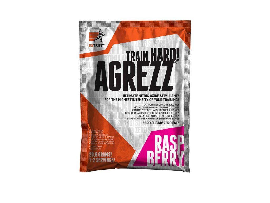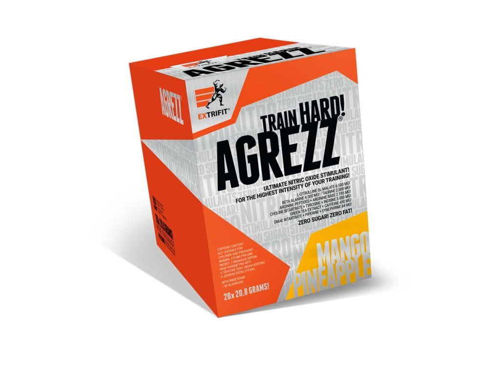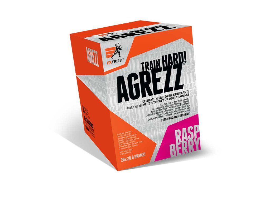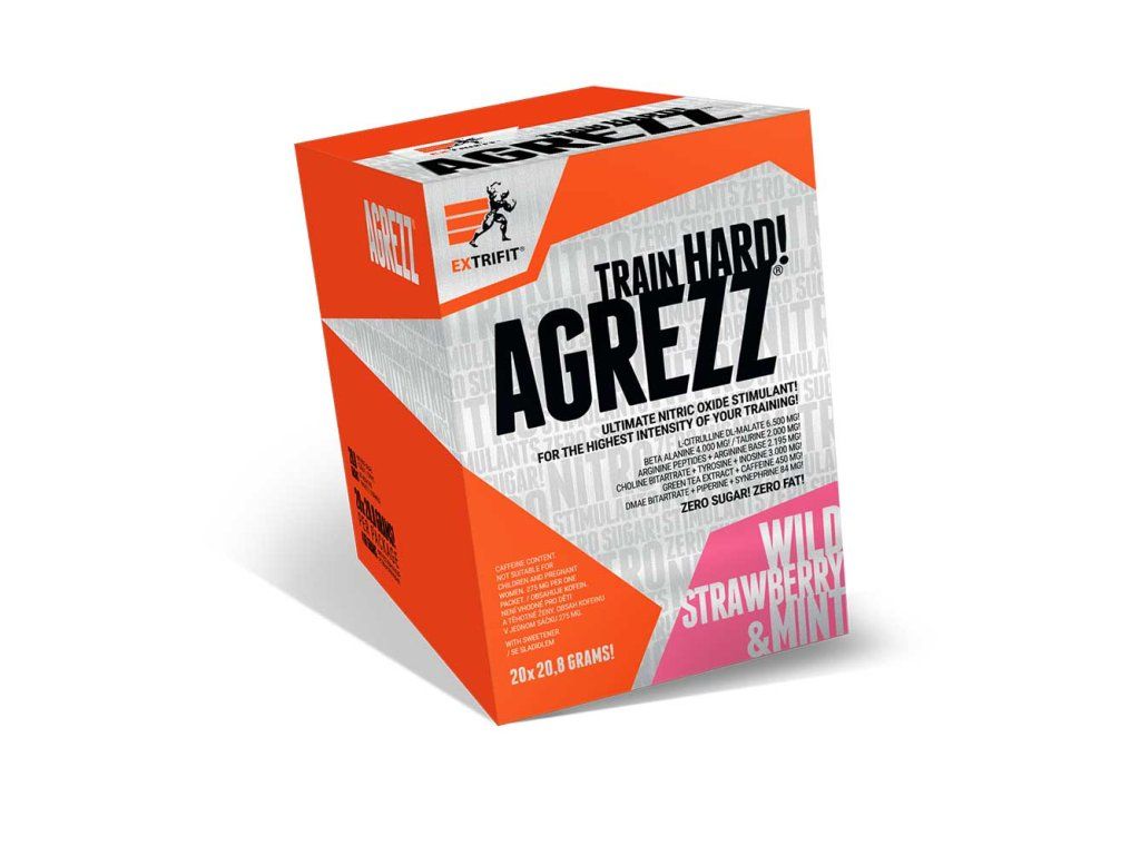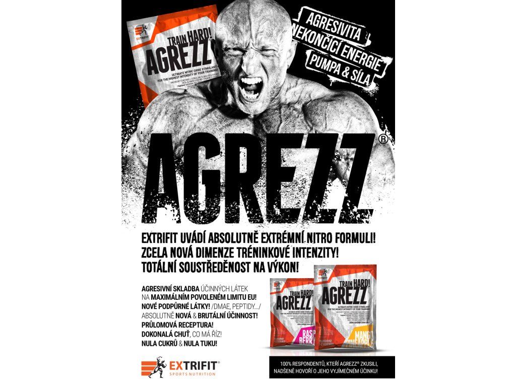 ! Obsahuje kofein, není vhodné pro děti a těhotné ženy. Denní dávka (20,8 g) obsahuje 275 mg kofeinu. Produkt není vhodný pro osoby trpící přecitlivělostí na kofein. Za výrazným účinkem produktu AGREZZ® stojí unikátní know-how značky Extrifit®, která sestavila jedinečnou a dosud nepřekonanou recepturu. Absolutní vyváženost, vzájemná synergie a velké množství aktivních látek na samé hranici zákona! O dokonalosti složení a jeho účincích svědčí stovky veřejně dostupných recenzí. Vrcholná receptura produktu AGREZZ® Celkem 8 850 mg pumpovacích látek: citrulin DL-malát, arginin a prémiová složka PepForm® Arginine Peptides – mimořádně silný arginin v peptidové formě! Jedná se o unikátní složku, kterou používají jen ty nejdražší a nejlepší produkty na trhu! Aminokyselina beta-alanin v ohromné dávce 4 000 mg pro maximální výdrž svalů. Aminokyselina tyrosin v dávce 1 000 mg pro dosažení optimálního fyzického a mentálního výkonu. Kofein, taurin a extrakt zeleného čaje podpoří soustředění na výkon, nakopnou a oddálí pocit únavy. Vy tak budete moct efektivně trénovat po delší dobu než normálně! DMAE a inosin: moderní předtréninkové látky, které najdete jen v těch nejpokročilejších produktech. Každý sáček skrývá maximální povolenou denní dávku DMAE, kterou můžete v ČR pořídit! Piperin (extrakt z pepře): velmi ceněná látka s řadou pozitivních účinků na zdraví – podporuje imunitu, činnost jater, krevní oběh v malých cévách a maximalizuje účinky ostatních látek v produktu. Cholin a synefrin (extrakt z pomerančovníku) přispívají k využití tuků v energetickém metabolismu. Na své si tak přijdou i sportovci v rýsovací fázi a ti, kteří si hlídají tělesnou hmotnost. Extra silný pre-workout vhodný i do diety Velkou výhodou produktu je nulový obsah sacharidů a tuku. Produkt je tak vhodný i pro sportovce ve fázi rýsování. Navíc díky účinným látkám, jako jsou zelený čaj, piperin nebo cholin, podporuje AGREZZ® efektivní metabolismus tuků. Tento produkt je určen pro náročné sportovce. Zažijete novou dimenzi tréninku! Je to skutečně silný produkt, dodržujte tedy doporučené dávkování a neužívejte jej krátce před spánkem. Je tak silný, že jeho účinek by mohl přetrvávat i v době, kdy již potřebujete regenerovat. Dokonalá chuť v praktickém balení Většina pre-workoutů nechutná dobře, to ale není případ produktu AGREZZ®! Díky mnohaletým zkušenostem s ochucováním suplementů jsme všechny příchutě vyladili k absolutní dokonalosti. Vzhledem k vysokému obsahu a typu účinných látek se tak jedná o naprostý unikát! A abyste nemuseli odsypávat prášek z velkého balení, Extrifit® pro Vás připravil produkt v sáčcích, ve kterých je dávka naprosto přesně odměřena. Sáček je malý, praktický a můžete jej vzít s sebou kamkoliv. V případě potřeby stačí rozpustit ve vodě a nápoj je hotov! Doporučené dávkování: pokročilí sportovci celý sáček (20,8 g), začátečníci a osoby s nízkou tělesnou hmotností polovinu sáčku (10,4 g) celý sáček rozpusťte ve 300 ml vody, polovinu sáčku rozpusťte ve 150 ml vody určeno k okamžité konzumaci před začátkem užívání doporučujeme provést test tolerance s polovinou sáčku pro ověření, zda netrpíte přecitlivělostí na některou z obsažených látek, či se u Vás neprojevují nežádoucí účinky Tabulka nutričních hodnot: Obsah účinných látek: 20,8 g Aminokyseliny: L-citrulin DL-malát 6 850 mg - z toho L-citrulin* 4 550 mg Beta-alanin* 4 000 mg Taurin* 2 000 mg L-Tyrozin* 1 000 mg L-Arginin* 1 695 mg L-Arginin peptidy PepForm® 305 mg Celkový obsah argininu 2 000 mg Celkem aminokyselin 13 550 mg Agrezz matrix: Extrakt ze zeleného čaje (30 % přírodního kofeinu) 250 mg Kofein bezvodý 200 mg DMAE bitartrát 54 mg - z toho DMAE 20 mg Synefrin 10 mg Piperin 20 mg Cholin bitartrát 1 000 mg Inosin 1 000 mg Celkový obsah kofeinu 275 mg *Obsah volných aminokyselin Složení: Pomeranč L-citrulin DL-malát 2 : 1, beta-alanin, taurin (protispékavá látka: oxid křemičitý 0,5 %), L-arginin, cholin bitartrát, L-tyrosin, inosin, L-arginin peptidy PepForm®, extrakt ze zeleného čaje (30 % přírodního kofeinu), kofein bezvodý, DMAE bitartrát, extrakt z černého pepře (95 % piperinu), extrakt z pomerančovníku hořkého (95 % synefrinu). Přídatné látky: aroma, protispékavé látky: fosforečnan vápenatý a oxid křemičitý, přírodní barvivo: beta karoten, sladidlo: sukralóza. Mango-ananas L-citrulin DL-malát 2 : 1, beta-alanin, taurin (protispékavá látka: oxid křemičitý 0,5 %), L-arginin, cholin bitartrát, L-tyrosin, inosin, L-arginin peptidy PepForm®, extrakt ze zeleného čaje (30 % přírodního kofeinu), kofein bezvodý, DMAE bitartrát, extrakt z černého pepře (95 % piperinu), extrakt z pomerančovníku hořkého (95 % synefrinu). Přídatné látky: protispékavé látky: fosforečnan vápenatý a oxid křemičitý, aromata, přírodní barvivo: beta karoten, sladidlo: sukralóza. Malina L-citrulin DL-malát 2 : 1, beta-alanin, taurin (protispékavá látka: oxid křemičitý 0,5 %), L-arginin, cholin bitartrát, L-tyrosin, inosin, L-arginin peptidy PepForm®, extrakt ze zeleného čaje (30 % přírodního kofeinu), kofein bezvodý, DMAE bitartrát, extrakt z černého pepře (95 % piperinu), extrakt z pomerančovníku hořkého (95 % synefrinu). Přídatné látky: protispékavé látky: fosforečnan vápenatý a oxid křemičitý, aroma, přírodní barvivo: červená řepa, sladidlo: sukralóza. Divoká jahoda – máta L-citrulin DL-malát 2 : 1, beta-alanin, taurin (protispékavá látka: oxid křemičitý 0,5 %), L-arginin, cholin bitartrát, L-tyrosin, inosin, L-arginin peptidy PepForm®, extrakt ze zeleného čaje (30 % přírod