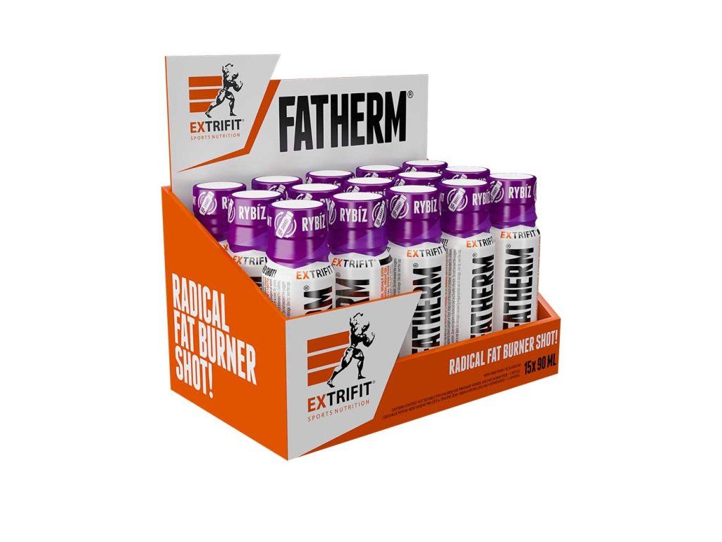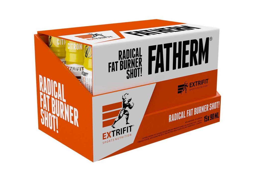 ! Obsahuje kofein, není vhodné pro děti a těhotné ženy. Denní dávka (1 shot = 90 ml) obsahuje 204,7 mg kofeinu. Produkt není vhodný pro osoby trpící přecitlivělostí na kofein. FATHERM® = spalování tuku na nejvyšší úrovni! Zkuste srovnat s čímkoli jiným. Nesrovnatelné! Tak ohromné množství látek a v tak vysokém množství vám nabídne jen FATHERM® Extrifit. Pozor! Legální komponenty v legální dávce. Extrifit FATHERM® je pro ty z vás, kteří přijdete do fitka s cílem shodit tuk, požádáte recepci o nejsilnější spalovač a podají Vám FATHERM®. FATHERM® je multikomponentní doplněk stravy od společnosti Extrifit určený pro spalování tuku, a to díky obsahu extraktu z Garcinia cambogia, extraktu z guarany, ze zeleného čaje, extraktu z chaluhy bublinaté (kelp), extraktu z Citrus aurantium (synefrin) a extraktům z černého a kajenského pepře. Tento produkt je v tekuté formě zajišťující rychlou stravitelnost. Jsou produkty, které potřebujete mít s sebou, abyste si je mohli dát přesně v daný čas, typicky před tréninkem, v jeho průběhu nebo po něm. To se týká i spalovačů tuku. Zvlášť když musíte na trénink cestovat, v tašce máte spoustu jiných věcí a vláčet s sebou ještě velké balení suplementů, odsypávat z něj potřebné množství, ředit nápoj… to vše je zbytečné, když můžete mít s sebou jednorázové praktické balení, a to ještě v tekuté formě s rychlou a výbornou stravitelností. Nic nemusíte míchat, šejkrovat, připravovat. Otevřete jen lahvičku a vypijete. A navíc! My v Extrifitu naprosto přesně uvádíme obsah látek v každé dávce. Nemlžíme, nepíšeme obsah na 100 gramů nebo na 1 litr a podobné mystifikace. Píšeme přímo na obalu obsah účinných látek v každé jedné lahvičce, kterou vypijete! Účinné látky produktu FATHERM®: extrakt z Garcinia cambogia (50% obsah kyseliny hydroxycitrónová HCA) - efektivně ovlivňuje metabolismus tuků, pomáhá redukci tělesné hmotnosti a snižuje chuť k jídlu kofein – pomáhá zlepšit soustředění, zvýšit pozornost, bystrost a hbitost, pomáhá zvýšení vytrvalostního výkonu extrakt z kořene smetanky lékařské (dandelion 5 %) – podporuje činnost kardiovaskulárního systému, činnost jater a metabolismus sacharidů, působí protizánětlivě extrakt z guarany (obsah přírodního kofeinu 10 %) – je účinný v kontrole tělesné hmotnosti, podporuje metabolismus tuků a normální trávení, podporuje funkci imunitního systému, snižuje pocity únavy, zvyšuje fyzickou i psychickou vitalitu extrakt ze zeleného čaje (obsah přírodního kofeinu 30 %) – podporuje metabolismus tuků a je účinný v kontrole tělesné hmotnosti, podporuje pružnost cév a normální hladinu cholesterolu a normální hladinu glukózy v krvi, je účinným antioxidantem a zlepšuje duševní stav včetně lepší schopnosti koncentrace pozornosti a učení extrakt z bílého čaje (obsah přírodního kofeinu 4,2 %) yerba maté extrakt (obsah přírodního kofeinu 1 %) extrakt ze zelené kávy (obsah přírodního kofeinu 10 %) extrakt z kurkumy (obsah kurkuminoidů 95 %) - podporuje činnost kardiovaskulárního systému, normální trávení, normální činnost jater, působí protizánětlivě a jako antioxidant, podporuje normální činnost nervové soustavy a duševní rovnováhu extrakt z chaluhy bublinaté (kelp) – přispívá ke kontrole tělesné hmotnosti a snižuje chuť k jídlu, podporuje normální činnost štítné žlázy a funkci hormonálního systému extrakt z černého pepře – podporuje normální trávení a kontrolu tělesné hmotnosti, působí jako antioxidant, podporuje oběh v jemných krevních cévách a kapilárách, podporuje zdraví jater, také normální činnost nervové soustavy, normální funkce dýchacího systému a normální stav pokožky extrakt z Citrus aurantium (95 % Synefrin) – je účinný v metabolismu lipidů a kontrole tělesné hmotnosti, podporuje normální funkce dýchacího systému, normální trávení a chuť k jídlu extrakt z kajenského pepře – přispívá ke kontrole tělesné hmotnosti, podporuje termogenezi, působí jako antioxidant, podporuje normální metabolismus sacharidů a lipidů, normální stav a růst vlasů a normální funkci žaludku. Produkt nabízíme ve dvou příchutích – citron a černý rybíz. Doporučené dávkování: denní dávka = 1 lahvička (90 ml) užívejte 10–20 minut před tréninkem, popřípadě ráno nalačno možnost ředění do 200 ml vody po otevření určeno k okamžité konzumaci Tabulka nutričních hodnot: Obsah účinných látek: 90 ml (1 dávka) Extrakt z Garcinia cambogia 250 mg - z toho kyselina hydroxycitronová 50 % 125 mg Aroma: malinové ketony 150 mg Kofein bezvodý 150 mg Extrakt ze zeleného čaje 100 mg - obsah přírodního kofeinu 30 % 30 mg Extrakt z bílého čaje 100 mg - obsah přírodního kofeinu 4,2 % 4,2 mg Extrakt z yerba maté 100 mg - obsah přírodního kofeinu 0,5 % 0,5 mg Extrakt z guarany 100 mg - obsah přírodního kofeinu 10 % 10 mg Extrakt ze zelené kávy 100 mg - obsah přírodního kofeinu 10 % 10 mg Extrakt z kořene smetanky lékařské 100 mg - z toho flavony 5 % 5 mg Extrakt z chaluhy bublinaté 10 : 1 50 mg Extrakt z kurkumy 26,4 mg - z toho kurkuminoidy 95 % 25 mg Extrakt z pomerančovníku hořkého 21,1 mg - z toho synefrin 95 % 20 mg Aroma: naringin 20 mg Extrakt z černého pepře 5,3 mg - z toho piperin 95 % 5 mg Extrakt z kajenského pepře 2,5 mg Celkový obsah kofeinu 204,7 mg Složení: voda, regulátor kyselosti: kyselina citronová, aroma, extrakt z Garcinia cambogia, stabilizátor: xanthan, konzervanty: sorban draselný a benzoan sodný, aroma: malinové ketony, kofein bezvodý, extrakt ze zeleného čaje, extrakt z bílého čaje, extrakt z yerba maté, extrakt z guarany, extrakt ze zelené kávy, extrakt z koř