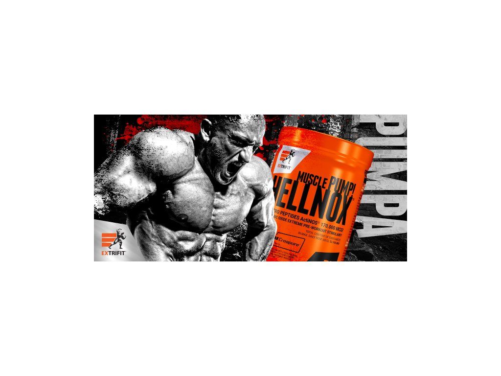 ! Obsahuje kofein, není vhodné pro děti a těhotné ženy. Denní dávka (20–60 g) obsahuje 90–270 mg kofeinu. Produkt není vhodný pro osoby trpící přecitlivělostí na kofein. Nyní Vám přinášíme inovaci produktu HELLNOX®. Výrobce ActiNOS® vyvinul novou, daleko koncentrovanější formu nitro peptidů (označovanou také jako CFM Nitro® P), a tu jsme použili v produktu Hellnox®! Pumpovací složku jsme obohatili o krystalický L-citrulin ve vysoce využitelné volné formě (free form). V inovovaném Hellnoxu® bylo také použito sladidlo z rostliny stévie, které je přírodního původu. Absolutní topovka od Extrifitu je skutečně průlomová. Něco tak komplexního a neuvěřitelně silného jste ještě neviděli! V produktu Hellnox® je vše, po čem Vaše svaly před tréninkem prahnou. Takže co Hellnox® umí, co dělá a proč Vám ušetří spoustu peněz? 1. Nakopává – a to tak, že Vám není takzvaně blbě (jak to dělají špatně sestavené nakopávače). Hellnox® Vás velmi jemně probudí, nastaví do pohotovostního režimu a rozproudí Vám krev. Ten pocit je doslova hmatatelný a velmi příjemný. Zvedne Vám sebevědomí. Chcete jít hned makat! Někteří kluci z Extrifit Teamu říkali: "Člověče, já si to dal a měl chuť dát někomu přes držku." Vtipné, trochu vulgární, ale pravdivé. Opravdu je to takový zajímavý stav, kdy cítíte – NĚCO SE DĚJE! – a je to příjemné. Pozor! Nečekejte na trénink dlouho, běžte do 20 minut makat. Pokud v tréninku nevybijete vlnu energie, kterou Vám Hellnox® dá, může Vás ta vlna rozhodit. Tak je to silné! Takže vyzkoušejte 1, 2 nebo 3 odměrky a zjistěte svou toleranci. Jakmile ucítíte nástup účinku, hned začněte makat! 2. Pumpuje – strašně moc! Proč? Protože ve speciálním matrixu EXTREME PUMPING 5! je bez přehánění nejdokonaleji vymakaná směs toho nejlepšího, co pro prokrvení a napumpování svalů existuje! A to ve strašně velké dávce. Hellnox® kombinuje absolutní TOP látky: ActiNOS® (neboli CFM Nitro® P) v množství 170 mg* – unikátní patentovaná složka hydrolyzovaného syrovátkového izolátu obohaceného o prémiové, selektivně vybrané peptidy L-citrulin DL-malát a L-citrulin free form (krystalický L-citrulin) v množství 5 545 mg* L-arginin AKG a L-arginin free form (krystalický L-arginin) v rekordním množství 7 000 mg* Celkem tedy pumpovací a prokrvovací nálož v množství 12 715 mg! Toto nemá obdoby, jen se podívejte na etikety jiných produktů této kategorie – Hellnox® nesnese srovnání s ničím, co jste dosud viděli. K čemu je Vám vlastně prokrvení a napumpování? Tak zaprvé – k dobrému pocitu skvěle odjetého tréninku. Svaly plné krve a nažílované bicepsy, které ani nejdou ohnout. Tenhle pocit je k nezaplacení. A zadruhé – ta krev, která Vám pumpuje v rozšířených řečištích žil a natlakovaných svalových buňkách – tak tato krev v sobě váže vše, co jste do těla dodali jídlem. A řádně rozprouděné a nakrmené svaly ROSTOU! Hellnox® tímto ale rozhodně nekončí... 3. Anabolické a antikatabolické volné (free form) aminokyseliny Hellnox® má v sobě obrovské dávky toho, co svalům chutná nejvíc. Jsou to volné aminokyseliny. Ale tady pozor! V suplementu Hellnox® používáme doslova volné (free form) aminokyseliny nikoliv jen na ozdobu, ale musíte počítat s tím, že Hellnox® jich v sobě obsahuje megadávky! Ve 3 odměrkách je celkem 10 gramů volných aminokyselin: 5 gramů krystalického glutaminu (aminokyselina, kterou je tvořen sval z 50–60 %) a 5 gramů krystalických BCAA ve správném poměru 2:1:1. Tyto aminokyseliny proudí v rozšířených cévách a strašně rychle se dostávají do svalů. Je to jejich potrava. IHNED! Žádné trávení, nic! Hned při tréninku Vám do svalů teče masivní dávka čistých aminokyselin glutaminu a BCAA. V tom je kouzlo kombinace "pumpováku" s vysokým obsahem volných aminokyselin. Jejich regenerační schopnost navíc způsobí, že nebudete druhý den totálně rozlámaní. Budete fit! Zůstane jen příjemná bolest svalů z dobře odjetého tréninku. 4. Energie ze speciálně sestaveného matrixu: je úplně jedno, jak moc jste rozbití nebo unavení, ENERGY & MENTAL FOCUS 5! MATRIX v množství 11 550 mg Vás probudí raz dva! Obsahuje stimulační fúzi, sestavenou ze silné trojkombinace kofein – extrakt zeleného čaje – taurin. Svaly pro změnu ocení silnou kombinaci beta-alaninu v množství 4 000 mg* s kreatinem Creapure® – německý, 100% čistý kreatin monohydrát chráněný ochrannou známkou! V produktu Hellnox® je ho rovných 5 gramů v nejvyšší denní dávce! Žádný lepší kreatin jednoduše není, takže pro Hellnox® jediná volba. 5. CARBO MATRIX: pomalé + střední + rychlé sacharidy v poměru 3 : 2 : 1. Třemi díly je zastoupena palatinóza (izomaltulóza), špičkový sportovní sacharid s nízkým glykemickým indexem, tráví se pomalu, a přesto Vám dává tolik energie jako jednoduchý cukr. V produktu Hellnox® je až 9 750 mg palatinózy! K tomu přidejte dva díly maltodextrinu a jeden díl dextrózy a máte perfektní sacharidovou směs, která zajistí optimální nástup účinku suplementu Hellnox®. Hellnox® = úspora peněz! nemusíte kupovat glutamin (v suplementu Hellnox® ho je 5 000 mg*) nemusíte kupovat BCAA (v suplementu Hellnox® je jich 5 000 mg*) nemusíte kupovat nabuzováky do tréninku (v suplementu Hellnox® je jich 2 550 mg*) nemusíte kupovat kreatin (v suplementu Hellnox® je ho 5 000 mg* v nejvyšší možné kvalitě Creapure®) a už vůbec nekupujte žádné "jako" NO produkty, když je tu Hellnox® * v nejvyšší denní dávce (3 odměrky) Hellnox® není jen pro pokročilé! Sledujte tabulku na zadní straně obalu. Vzhledem k síle suplementu Hellnox® jsme rozdělili dávkování pro: začáte