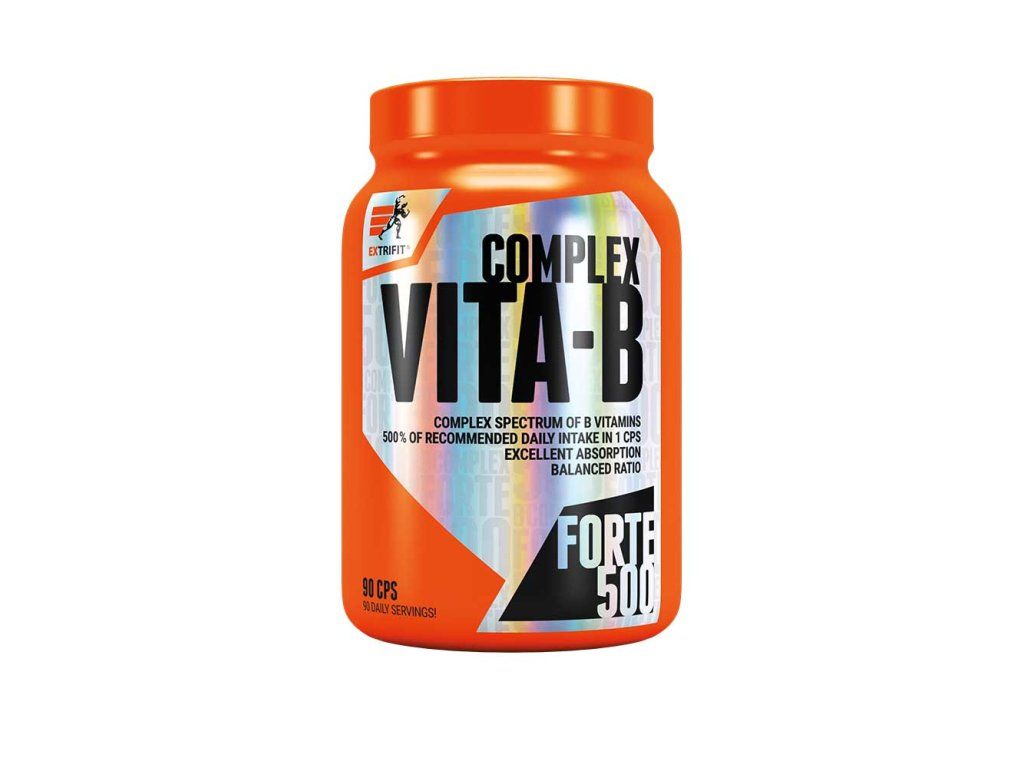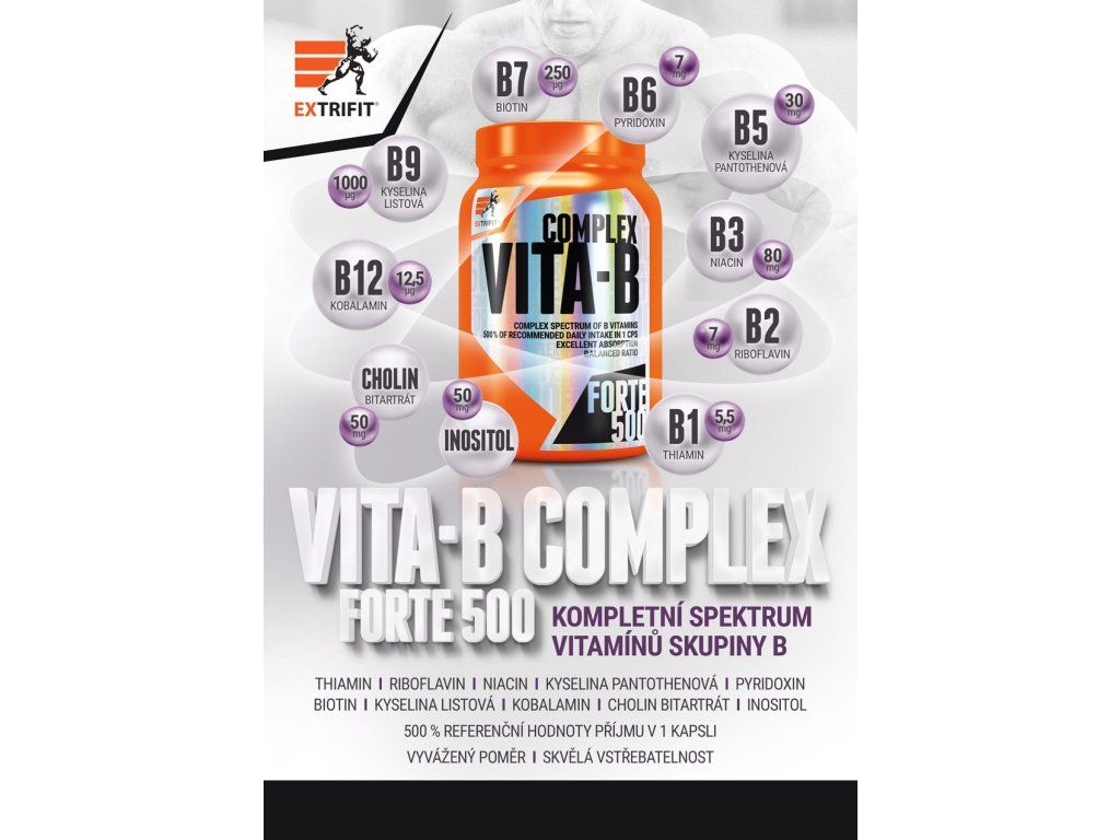 Kdy je vhodné doplnit vitamíny skupiny B ve formě doplňku stravy? V různých situacích, kdy se výrazně zvedá jejich spotřeba a/nebo když není možné zajistit stravou jejich dostatečný příjem. To se stává často právě u sportovců, kdy při intenzivní tělesné zátěži stoupá spotřeba vitamínů - a právě v kulturistice to bývá umocněno ještě rýsovací restriktivní dietou.Produkt B COMPLEX FORTE 500 je vyroben v kapslích pro vynikající vstřebatelnost a přesné dávkování. Každá kapsle je potištěna logem EXTRIFIT®. Potisk kapslí je minerální, přírodní. Účinky obsažených vitamínů ze skupiny B: Thiamin přispívá k normálnímu energetickému metabolismu, k normální činnosti nervové soustavy a k normální psychické činnosti, přispívá k normální činnosti srdce. Riboflavin přispívá k normálnímu energetickému metabolismu, k normální činnosti nervové soustavy, k udržení normálního stavu sliznic a pokožky, přispívá k udržení normálních červených krvinek a k normálnímu metabolismu železa, přispívá k udržení normálního stavu zraku a k ochraně buněk před oxidativním stresem, přispívá ke snížení míry únavy a vyčerpání. Niacin přispívá k normálnímu energetickému metabolismu, k normální činnosti nervové soustavy a k normální psychické činnosti, přispívá k udržení normálního stavu sliznic a pokožky a ke snížení míry únavy a vyčerpání. Biotin přispívá k normálnímu energetickému metabolismu, k normální činnosti nervové soustavy a k normální psychické činnosti, přispívá k normálnímu metabolismu makroživin, k udržení normálního stavu sliznic a k udržení normálního stavu pokožky. Kyselina pantothenová přispívá k normálnímu energetickému metabolismu, k normální syntéze a metabolismu steroidních hormonů, vitamínu D a některých neurotransmiterů, přispívá ke snížení míry únavy a vyčerpání a k normální mentální činnosti. Pyridoxin přispívá k normálnímu energetickému metabolismu, k normální činnosti nervové soustavy a k normální psychické činnosti, přispívá k normálnímu metabolismu bílkovin a glykogenu, přispívá k normální tvorbě červených krvinek, k normální funkci imunitního systému, ke snížení míry únavy a vyčerpání a k regulaci hormonální aktivity. Kyselina listová přispívá k normální syntéze aminokyselin, k normální krvetvorbě a k normálnímu metabolismu homocysteinu, přispívá k normální psychické činnosti, k normální funkci imunitního systému, ke snížení míry únavy a vyčerpání a podílí se na procesu dělení buněk. Kobalamin přispívá k normálnímu energetickému metabolismu, k normální činnosti nervové soustavy a k normální psychické činnosti, přispívá k normální tvorbě červených krvinek a k normální funkci imunitního systému, přispívá ke snížení míry únavy a vyčerpání a podílí se na procesu dělení buněk. Cholin (vitagen, dříve řazený mezi vitamíny a označovaný také jako vitamín B8) přispívá k normálnímu metabolismu lipidů a k udržení normální činnosti jater. Produkt Vita-B Complex Forte 500 je vyroben v kapslích pro vynikající vstřebatelnost a přesné dávkování. Každá kapsle je potištěna logem Extrifit, potisk kapslí je minerální, přírodní. Doporučené dávkování: Užívejte 1 kapsli Vita-B Complex Forte 500 denně. Zapijte dostatečným množstvím tekutiny. Tabulka nutričních hodnot: Průměrný obsah energie a živin: 1 cps Energetická hodnota 7 kJ / 2 kcal Tuky 0 g - z toho nasycené mastné kyseliny 0 g Sacharidy 0,3 g - z toho cukry 0 g Vláknina 0 g Bílkoviny 0,1 g Sůl 0,01 g Obsah účinných látek: 1 cps Vitamín B3 – niacin (zdroj: nikotinamid) 80 mg (500 % RHP) Cholin bitartrát 50 mg Inositol 50 mg Vitamín B5 – kyselina pantothenová (zdroj: D-pantothenát vápenatý) 30 mg (500 % RHP) Vitamín B2 – riboflavin 7 mg (500 % RHP) Vitamín B6 – pyridoxin (zdroj: pyridoxin HCl) 7 mg (500 % RHP) Vitamín B1 – thiamin (zdroj: thiamin mononitrát) 5,5 mg (500 % RHP) Vitamín B9 – kyselina listová (zdroj: kyselina pteroylmonoglutamová) 1000 mcg (500 % RHP) Vitamín B7 – D-biotin 250 mcg (500 % RHP) Vitamín B12 (zdroj: kyanokobalamin) 12,5 mcg (500 % RHP) RHP - referenční hodnota příjmu (dříve doporučená denní dávka) Složení: nikotinamid, cholin bitartrát, inositol, D-pantothenát vápenatý, riboflavin, pyridoxin HCl, thiamin mononitrát, kyselina pteroylmonoglutamová, D-biotin, kyanokobalamin přídatné látky: nosič maltodextrin, kapsle (želatina, minerální barvivo oxid železitý, přírodní lešticí látka šelak) Upozornění: Skladujte v suchu při teplotě do 25 °C, pečlivě uzavřené, chraňte před přímým slunečním zářením a před mrazem. Uchovávejte mimo dosah dětí. Přípravek není určen pro děti, těhotné a kojící ženy. Výrobce neručí za škody vzniklé nevhodným použitím nebo skladováním. Výrobek není určen jako náhrada pestré stravy. Nepřekračujte denní doporučenou dávku. Po otevření spotřebujte do 3 měsíců. Spotřebujte do data uvedeného na obalu.Doplňkové parametry
