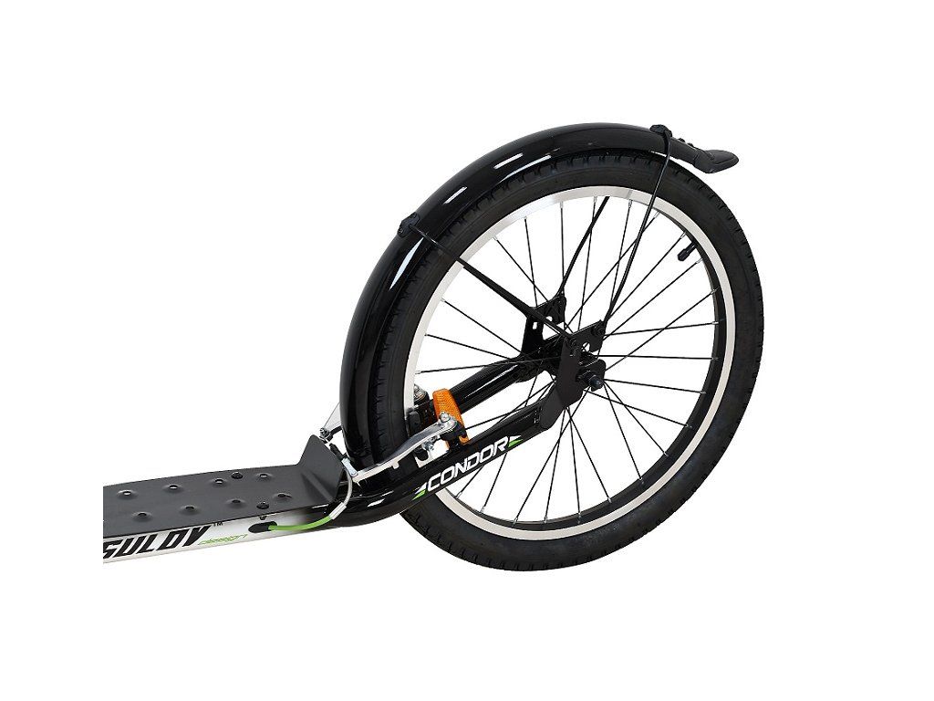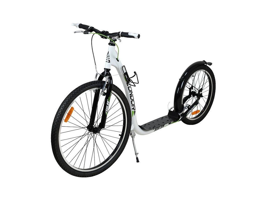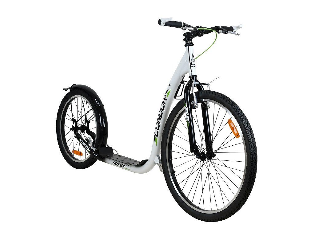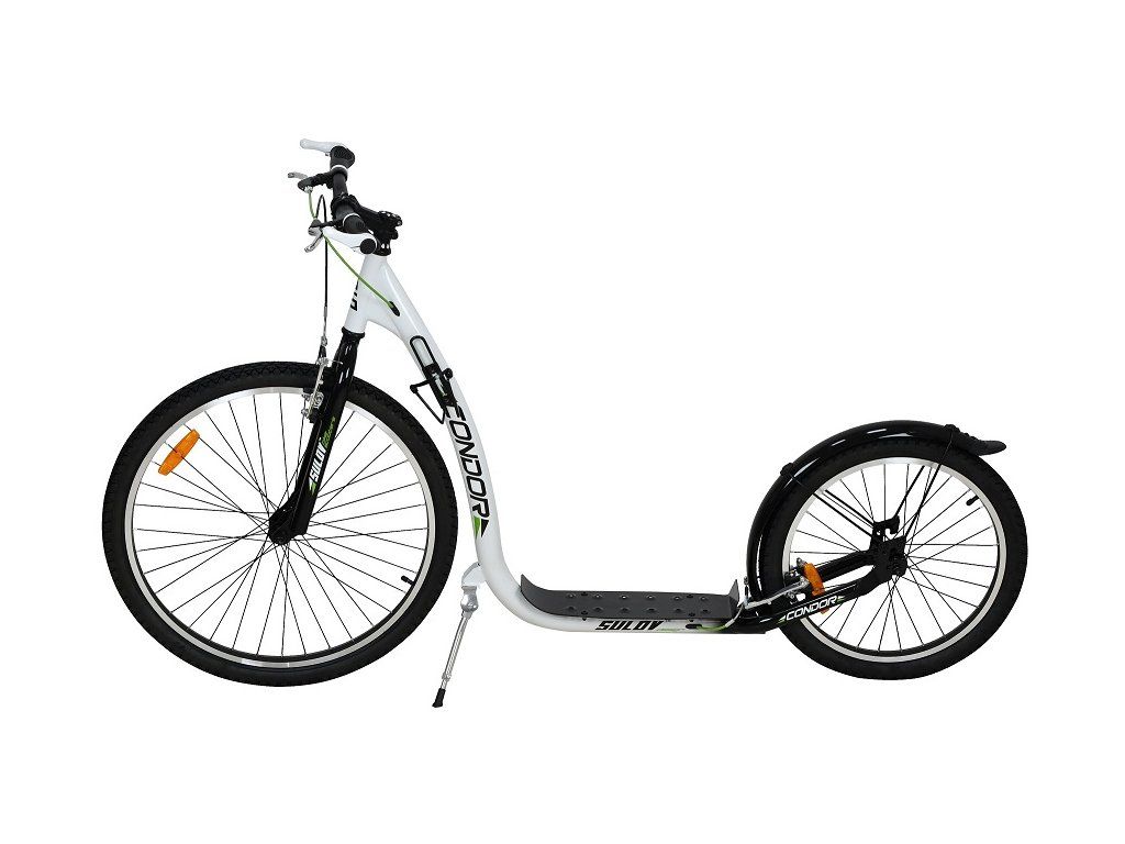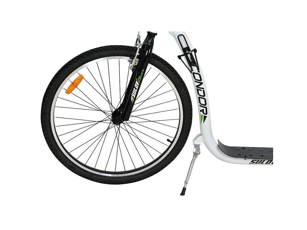 Sportovní koloběžka Sulov CONDOR je díky velkým nafukovacím kolům 26"/20" ideální pro jízdu ve městě i na zpevněných cyklostezkách. rám koloběžky z kvalitní odlehčené oceli ve výpletech kol jsou odrazky pro zvýšení bezpečnosti přední a zadní hliníkové V-brzdy hliníkové ráfky součástí vybavení je držák na lahev, sklopný stojánek, zadní ocelový blatník a rohy na řidítkáchDoplňkové parametry