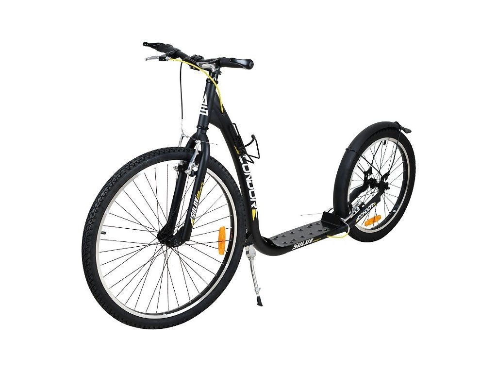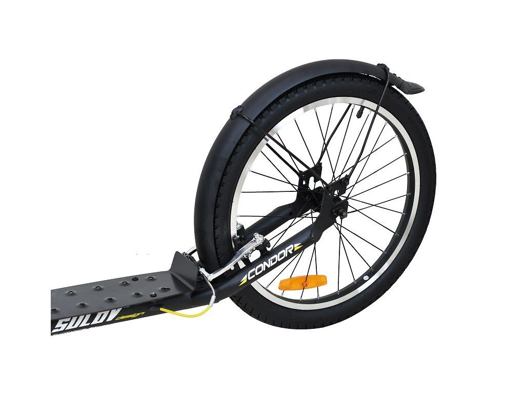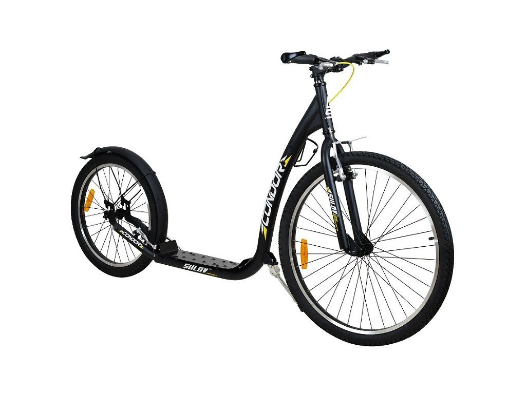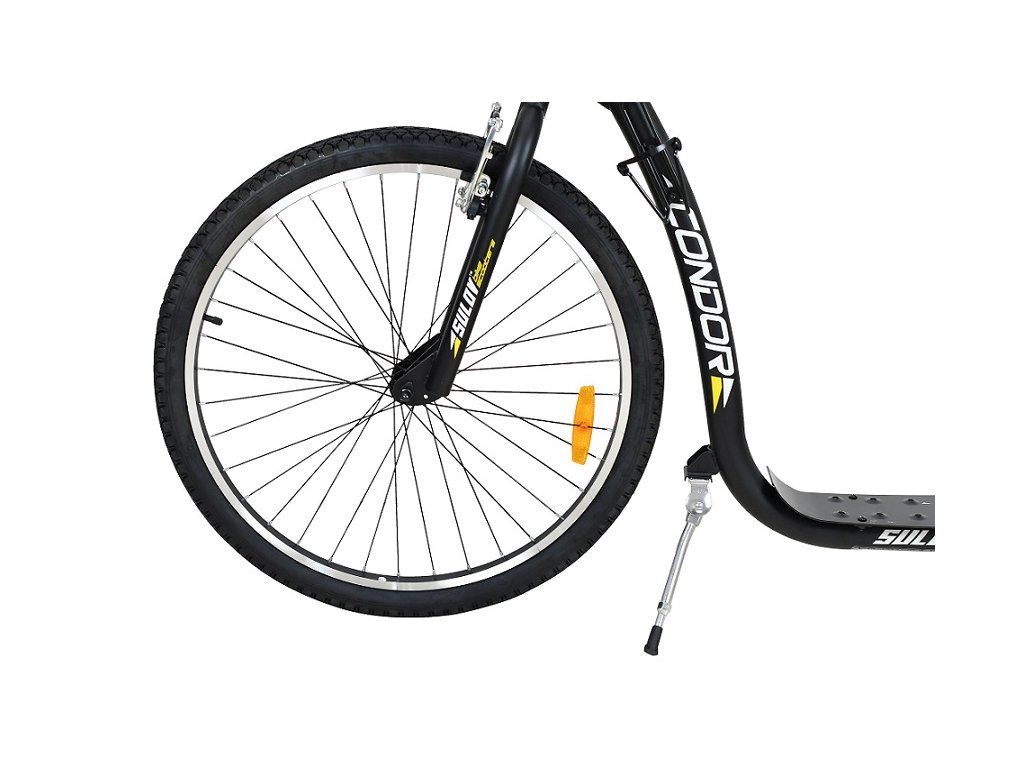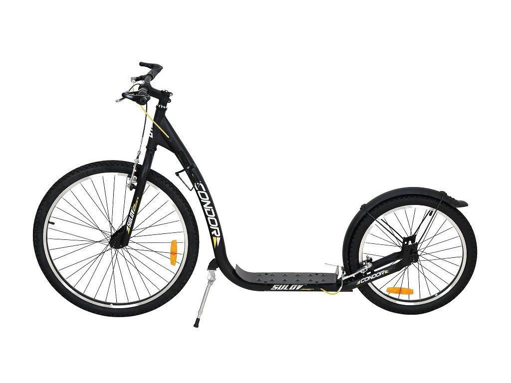 Sportovní koloběžka Sulov CONDOR je díky velkým nafukovacím kolům 26"/20" ideální pro jízdu ve městě i na zpevněných cyklostezkách. rám koloběžky z kvalitní odlehčené oceli ve výpletech kol jsou odrazky pro zvýšení bezpečnosti přední a zadní hliníkové V-brzdy hliníkové ráfky součástí vybavení je držák na lahev, sklopný stojánek, zadní ocelový blatník a rohy na řidítkáchDoplňkové parametry