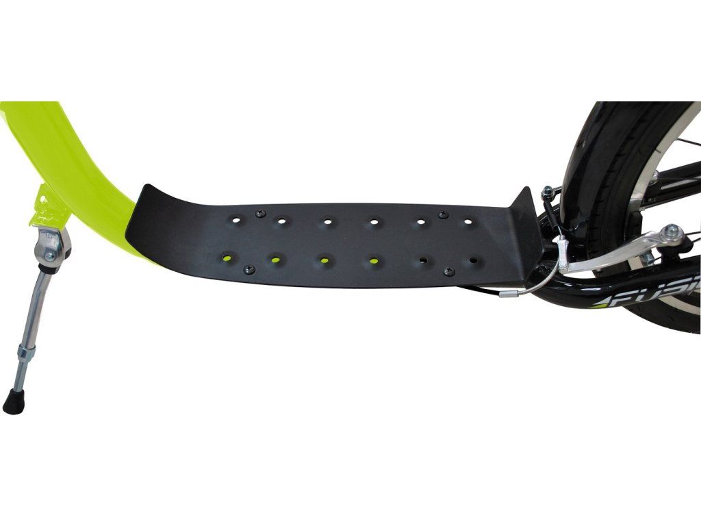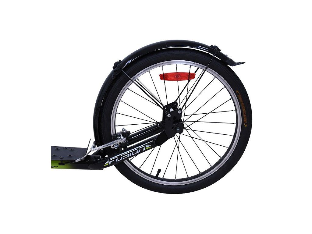 Sportovní koloběžka FUSHION je díky velkým nafukovacím kolům 26"/20" ideální pro jízdu ve městě i na zpevněných cyklostezkách. - Rám koloběžky z kvalitní odlehčené oceli - Ve výpletech kol jsou odrazky pro zvýšení bezpečnosti - Přední a zadní hliníkové V-brzdy - Hliníkové ráfky - Součástí vybavení je držák na lahev, sklopný stojánek, zadní ocelový blatník a rohy na řidítkách - Maximální nosnost 120 kg Technické parametry: - Pneumatiky: přední 26" x 1.75" a zadní 20" x 1.75" - Šířka řidítek: 59 cm - Výška řidítek 96 cm (není nastavitelná) - Celková délka: 170 cm - Velikost stupátka: délka 40 cm, šířka v nejširším místě 12 cm - Výška od země ke stupátku: 15 cm - Váha: 12.9 kgDoplňkové parametry