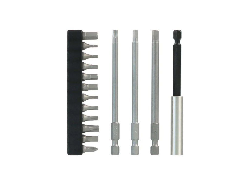 Bity obsahují 100 mm dlouhý nástavec, tři 100 mm dlouhé bity (hex 4, hex 5 e T25) a několik dalších Torx a šestihranných bitů ve standardní délce (25 mm). Všechny bity jsou vyrobeny ze speciální oceli S2 s velmi vysokou povrchovou tvrdostí (62 Hrc) pro zajištění maximální odolnosti.