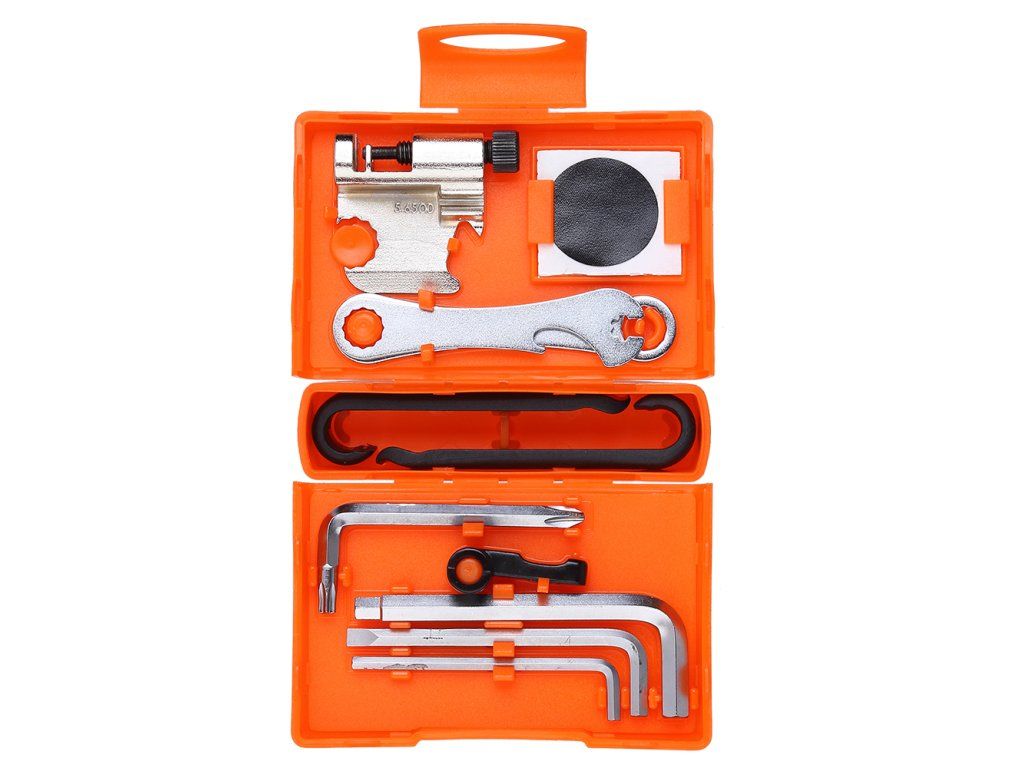 2x montpáka, 3x samolepící záplata, 1x zdrsňovač duše, nýtovač s centrklíči 3,2/3,5 a 3,3/3,5, maticový klíč 8mm, centrklíč Mavic, otevírač na láhve, maticový klíč 9 a 10mm, imbusy 3, 4, 5, 6 mm, torx T25, plochý a křížový šroubovák.