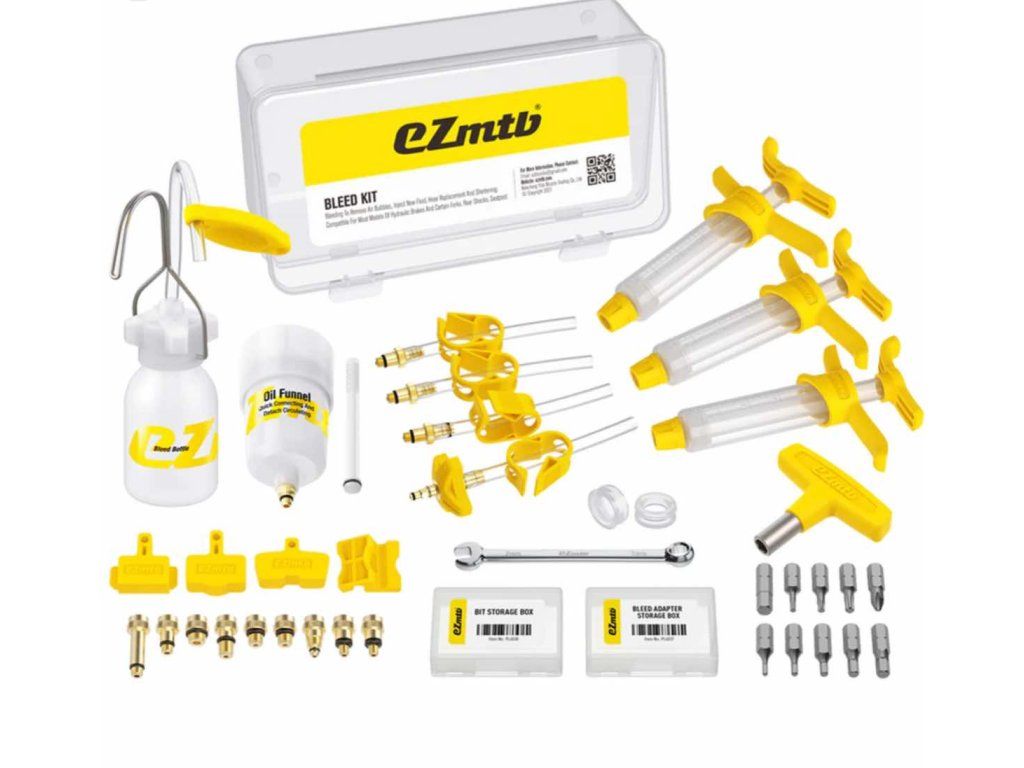 3x plnící stříkačka (+ 2ks náhradní těsnící O-kroužky), sada 11ks mosazných adaptérů pro plnění všech typů brzd, přepadová nádobka na kapalinu, adaptéry do stříkačky vč. silikonové hadičky a zaškrcovadla, 4ks silikonové hadičky, odvzdušňovací nádobka na Shimano, stranový klíč 7/8mm, torx T10 a T15, kleština pro instalaci hydraulických koncovek, 3ks vymezovaci vložka mezi pístky brzdiče, nástrčkový klič na bity, bity: křížový šroubovák PH2, TORX T10/T15/T25, imbusy: 2/2,5/3/4/5/6