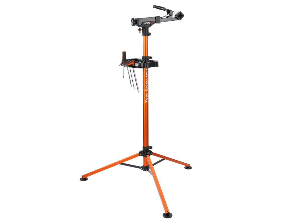 Stojan má otočnou rychloupínací hlavu, tácek na nářadí, stavitelnou výšku od 110 do 154 cm.