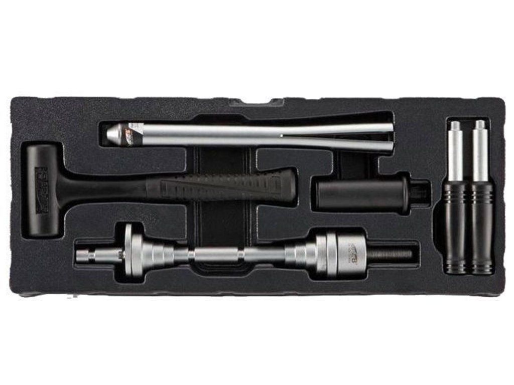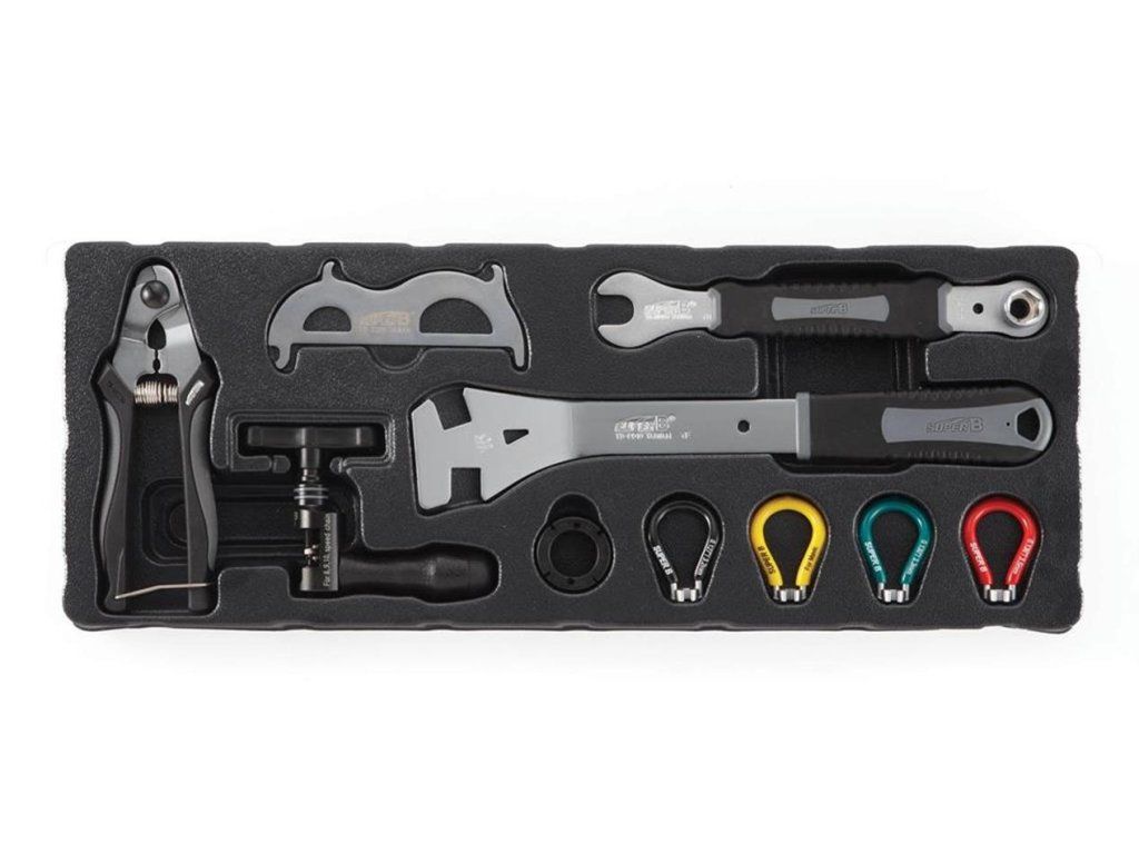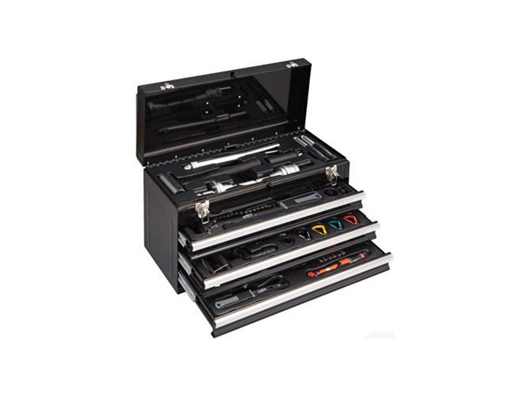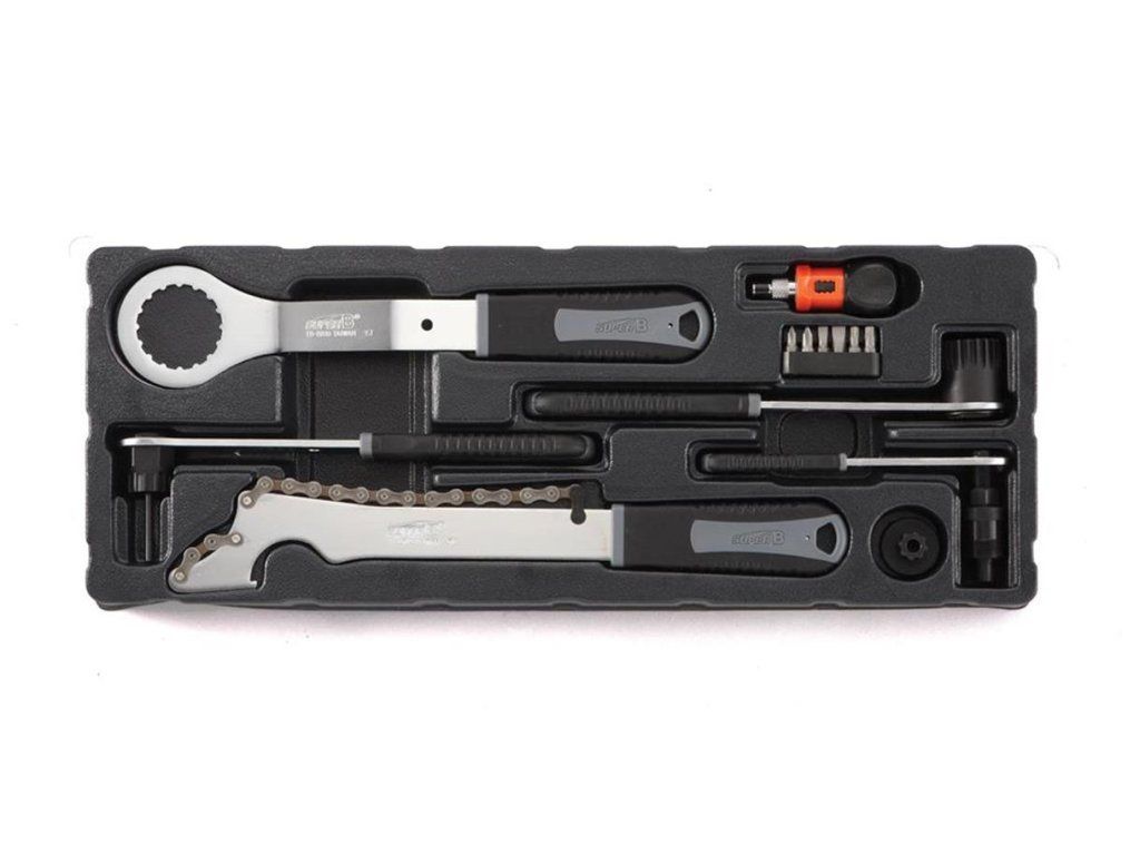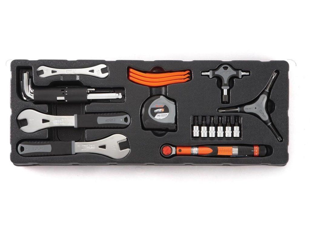 vyražeč misek hl. složení, plastová palička, naražeč ježka, lis na hl. složení, sada bitů, šroubovák s ráčnou, klíč na SH Hollowtech II, klíč na středové složení ISIS, klíč na kazety, stahovák na kliky s pákou, bič na kazety, klíč na dotahování axiální vůle SH Hollowtech II, stranový klíč 8/10, 3x montpáka, klíč na matky převodníků, tříramenný torx T25/30/40, kónusové klíče 13/14/15/17, sada imbusů, momentový klíč 3-15Nm, sada bitů pro momentový klíč, svinovací metr, kleště na bovdeny, nýtovač, držák plochých drátů, centrovací klíč 3,2; 3,3; 3,5 a MAVIC, pedálový klíč, pedálový klíč s ořechem 14/15mm