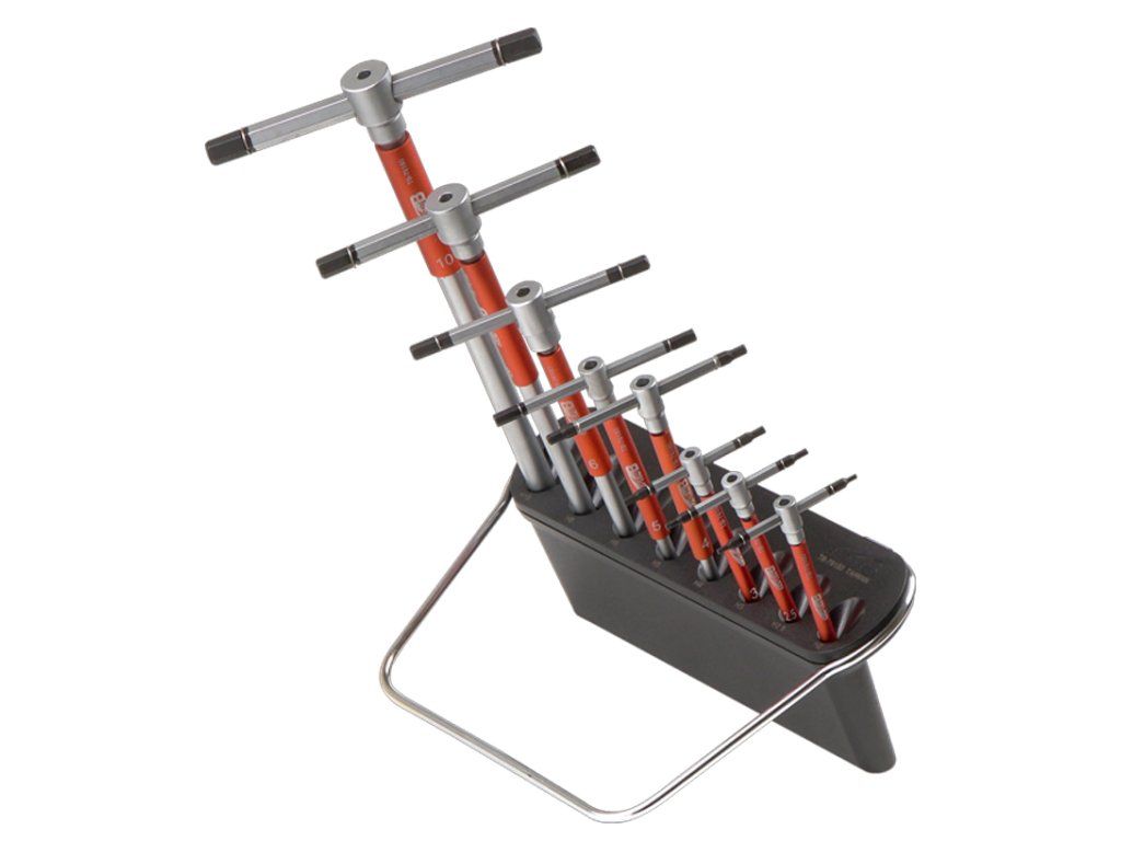 Sada 8 profesionálních imbusových klíčů s T-rukojetí, pokrývajících nejběžněji používané metrické velikosti na jízdních kolech: 2 / 2,5 / 3 / 4 / 5 / 6 / 8 / 10 mm