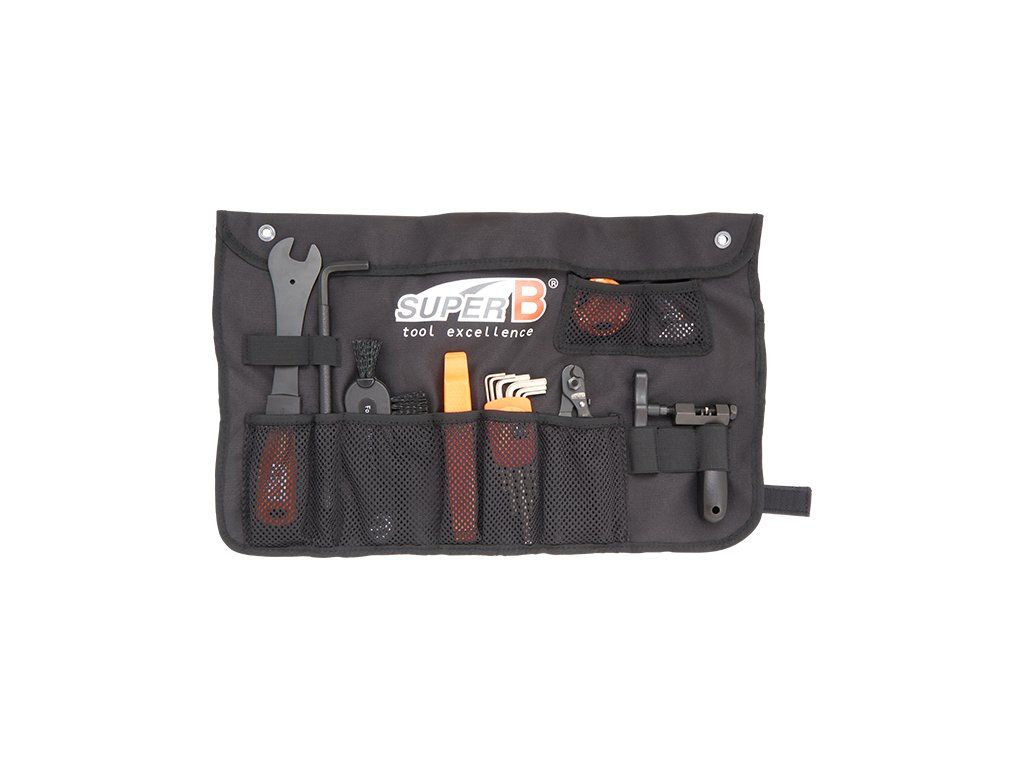 klíč na pedály 15mm, 8mm imbus s L-rukojetí, kartáč na čištění kazety a pastorku, 1x montpáky, sada imbusů 2;2,5; 3; 4; 5; 6mm , kleště na lanka a bovdeny, nýtovač, centrovací klíč 3,2/3,3/3,5mm, sada samolepících záplat, rolovací obal