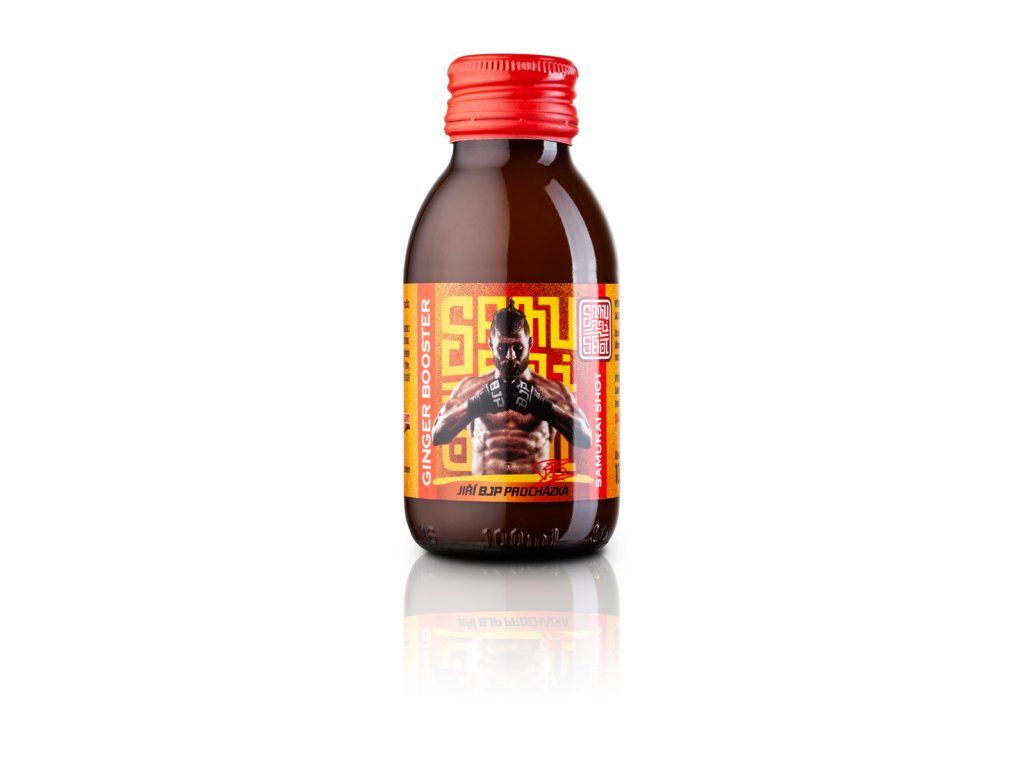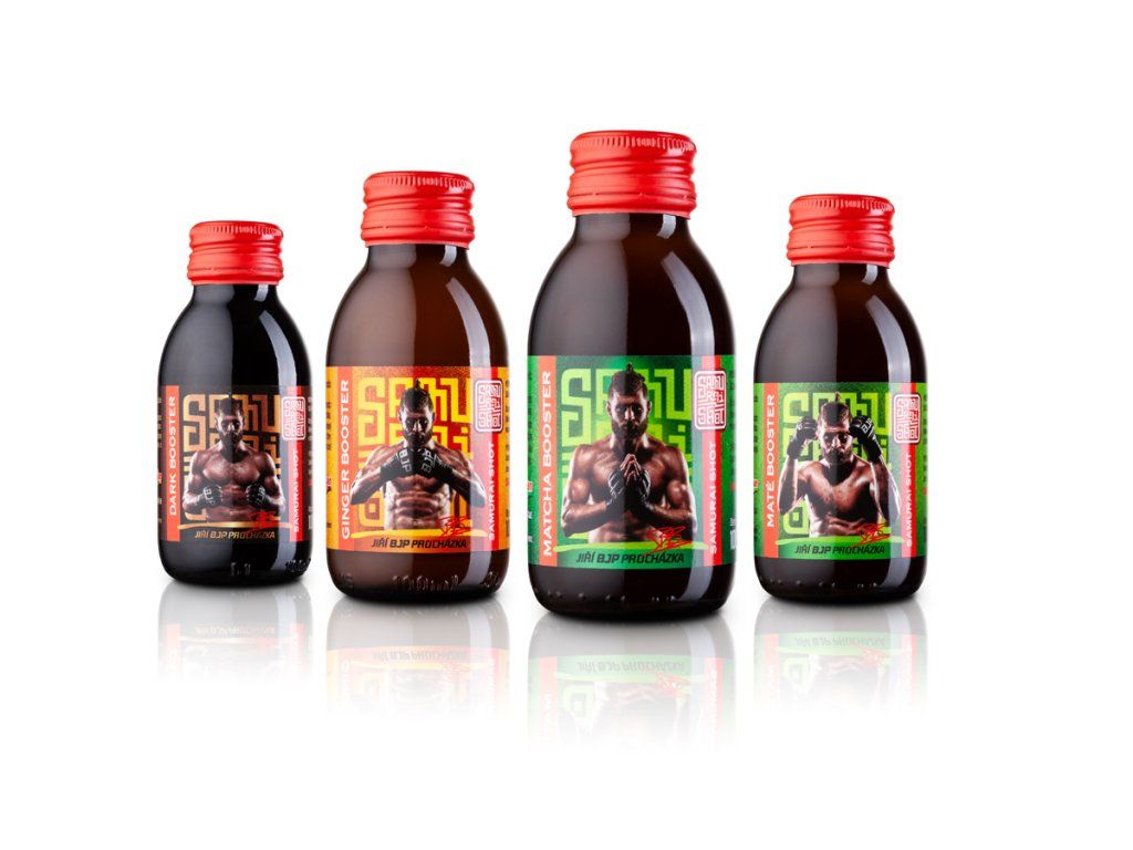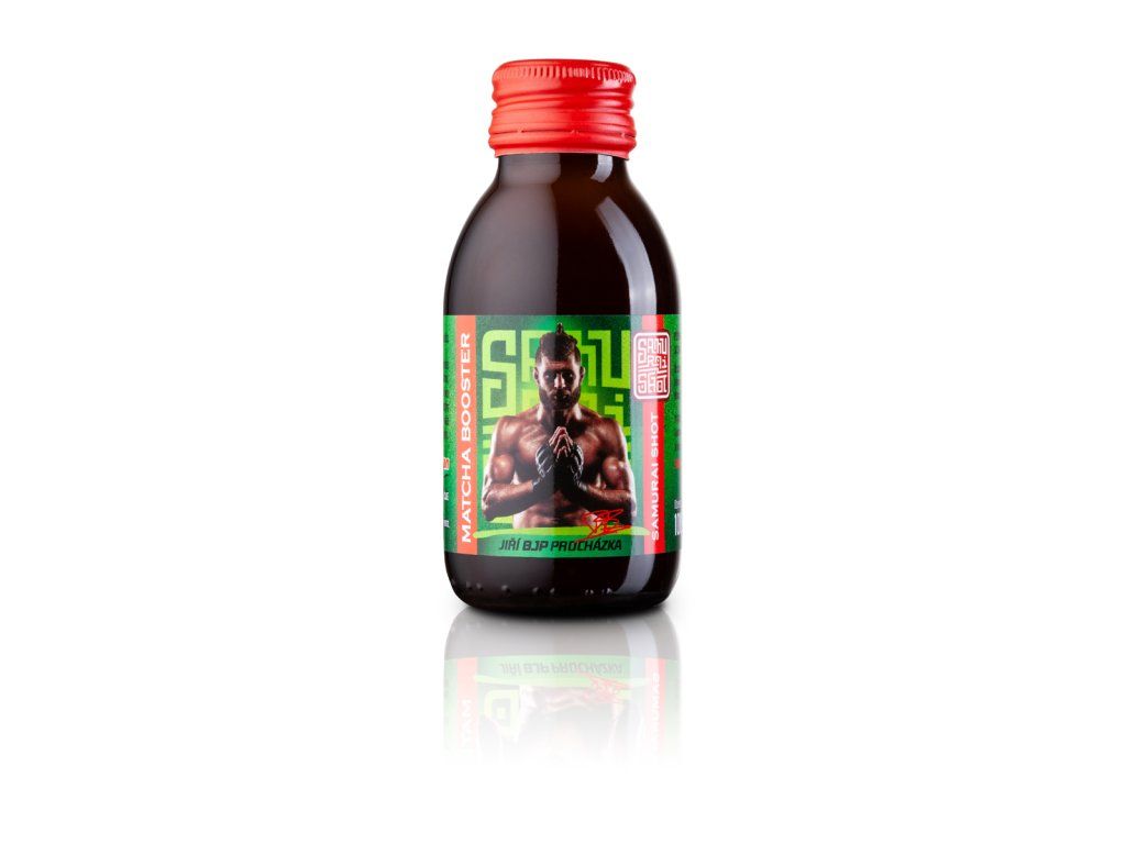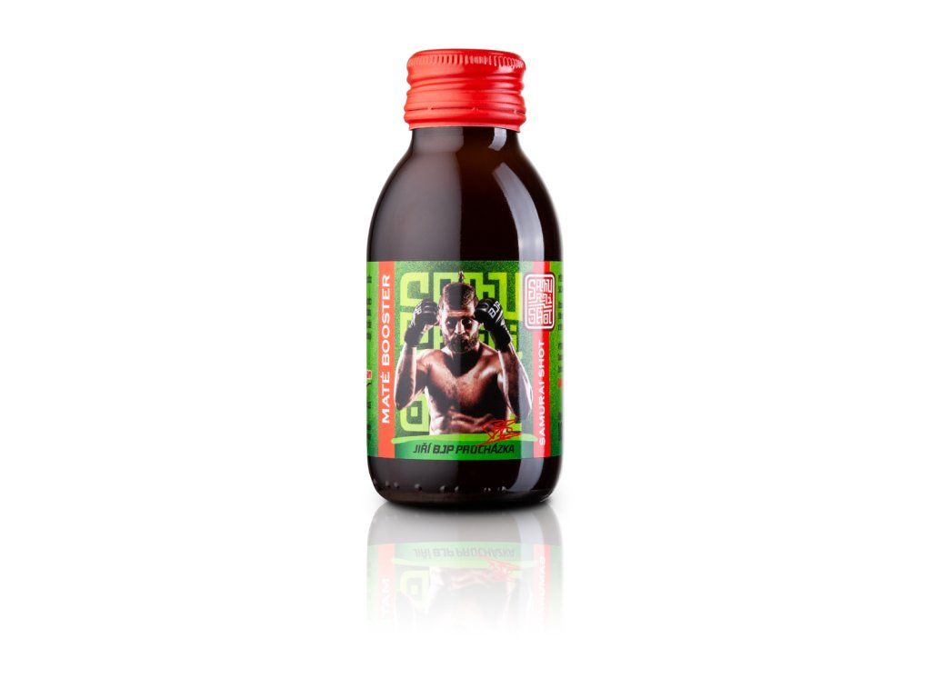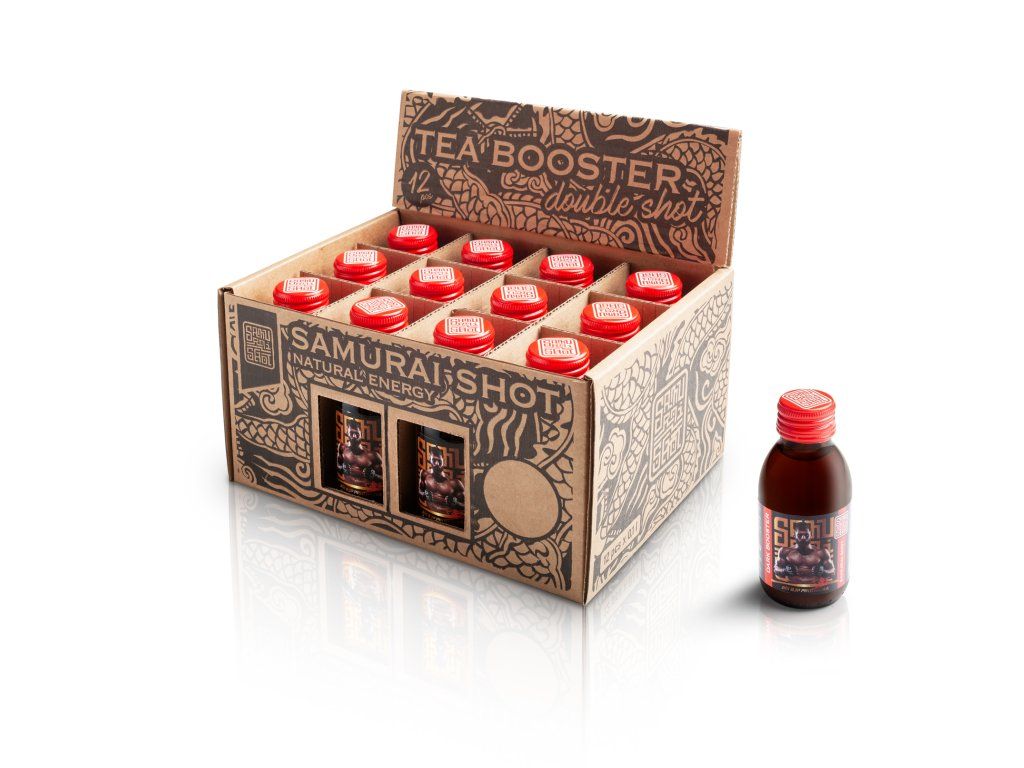 ! Obsahuje kofein, není vhodné pro děti a těhotné ženy. Denní dávka (1 ampule) obsahuje 180 mg kofeinu (Dark Booster), 80 mg kofeinu (Maté Booster), 120 mg kofeinu (Matcha Booster). Produkt není vhodný pro osoby trpící přecitlivělostí na kofein. Samurai Shot je prémiová značka funkčních nápojů z čajů a bylin. Exkluzivní edice vyladěná ve spolupráci s UFC bojovníkem Jiřím BJP Procházkou. DARK BOOSTER energetický nealkoholický nápoj z černého čaje "Energie a zemitost" - zemitost čínského černého čaje Pu-Erh. Citrusová chuť na začátku příjemně osvěží, zakončená dochutí hořké čokolády a bylin. Roztančí chuťové pohárky, osvěží, nakopne a rozjasní mysl. Žádný čajíček! Určeno milovníkům přírodního povzbuzení a chutí bez cukru. Zažij na vlastní lok. 180 mg kofeinu / 100 ml 0 % přidaného cukru vegan nápoj je založen na funkčnosti teinu ze silného čajového výluhu obsah čajového kofeinu je přibližně 180 mg v jedné lahvičce o obsahu 100 ml, což je větší množství kofeinu než v běžném 500 ml energy drinku čaj podporuje soustředění a dobré trávení doporučujeme užívat jako stimulant proti únavě nápoj má vysoký obsah kofeinu (obsah kofeinu 90 mg / 50 ml). GINGER BOOSTER nealkoholický nápoj z bylin a koření "Záře a vzplanutí" - zahřívací silák vyrobený z čerstvého zázvorového kořene, citrónové šťávy, kurkumy a chilli. Tato kombinace Vám zaručeně rozproudí energii v těle bez kofeinu 7 % přidaného cukru vegan MATÉ BOOSTER energetický nealkoholický nápoj z bylinného čaje s příchutí marakuji a chrpy "Radost a divokost" - osvěžující a nakopávací chuť brazilského maté v kombinaci s příchutí marakuji a citrusů. Dokonalé letní pití. Roztančí chuťové pohárky, osvěží, nakopne a rozjasní mysl. Žádný čajíček! Určeno milovníkům přírodního povzbuzení. Zažij na vlastní lok. 80 mg kofeinu / 100 ml 9 % přidaného cukru vegan nápoj je založen na funkčnosti teinu ze silného čajového výluhu obsah čajového kofeinu je přibližně 80 mg v jedné lahvičce o obsahu 100 ml, což je množství kofeinu jako v běžném 250 ml energy drinku čaj podporuje soustředění a dobré trávení doporučujeme užívat jako stimulant proti únavě nápoj má vysoký obsah kofeinu (obsah kofeinu 40 mg / 50 ml) MATCHA BOOSTER energetický nealkoholický nápoj ze zeleného čaje s příchutí hrušky "Zdraví a imunita" - inspirováno moderní japonskou kulturou. Kombinuje silný výluh ze dvou zelených čajů - Sencha ve spojení s čajem Matcha vzájemně umocní své účinky a vynikne silná listová chuť spojená se sladkostí hrušky. Roztančí chuťové pohárky, osvěží, nakopne a rozjasní mysl. Žádný čajíček! Určeno milovníkům přírodního povzbuzení a chutí bez přidaného cukru. Zažij na vlastní lok. 120 mg kofeinu / 100 ml 0 % přidaného cukru vegan nápoj je založen na funkčnosti teinu ze silného čajového výluhu obsah čajového kofeinu je přibližně 120 mg v jedné lahvičce o obsahu 100 ml, což je množství kofeinu jako v běžném 250 ml energy drinku čaj podporuje soustředění a dobré trávení doporučujeme užívat jako stimulant proti únavě nápoj má vysoký obsah kofeinu (obsah kofeinu 60 mg / 50 ml) Doporučené dávkování: Způsob užití: na přímo jako nealko panák (1 panák cca 50 ml) zředěné sodovkou nebo džusem jako ledový čaj míchaný s alkoholem jako energy koktejl zředěním horkou vodou jako silný teplý čaj v kuchyni k přípravě jídel, dezertů či zmrzlin Tabulka nutričních hodnot: Dark Booster Ginger Booster Maté Booster Matcha Booster Energetická hodnota 5 kJ/1 kcal 117 kJ/28 kcal 152 kJ/36 kcal 117 kJ/28 kcal Tuky <0,1 g <0,1 g <0,1 g <0,1 g - z toho nasycené mastné kyseliny <0,1 g <0,1 g <0,1 g <0,1 g Sacharidy <0,1 g 7 g 9 g 7 g - z toho cukry <0,1 g 7 g 9 g 7 g Bílkoviny <0,1 g <0,1 g <0,1 g <0,1 g Sůl 0 g 0 g 0 g 0 g Složení: Dark Booster: voda, 10 % sypaný černý čaj Pu-Erh, konzervant: kyselina citrónová Ginger Booster: voda, 10 % čerstvého zázvoru, kurkuma, chilli, citrónová šťáva z koncentrátu, třtinový cukr Maté Booster: voda, 10 % yerba maté, 9 % třtinový cukr, pomerančová kůra, jablka, květy chrpy, aroma marakuji, konzervant: kyselina citrónová Matcha Booster: voda, 9 % japonský zelený čaj Sencha, zelený čaj Matcha, 8 % hruškový koncentrát, konzervanty: kyselina citronová Upozornění: Obsahuje kofein, není vhodné pro děti a těhotné ženy. Denní dávka (1 ampule) obsahuje 180 mg kofeinu (Dark Booster), 80 mg kofeinu (Maté Booster), 120 mg kofeinu (Matcha Booster). Produkt není vhodný pro osoby trpící přecitlivělostí na kofein. Skladujte na stinném místě v teplotě mezi 0 do 30 °C. Po otevření spotřebujte ten samý den. Sediment či zakalení není na závadu.Doplňkové parametry