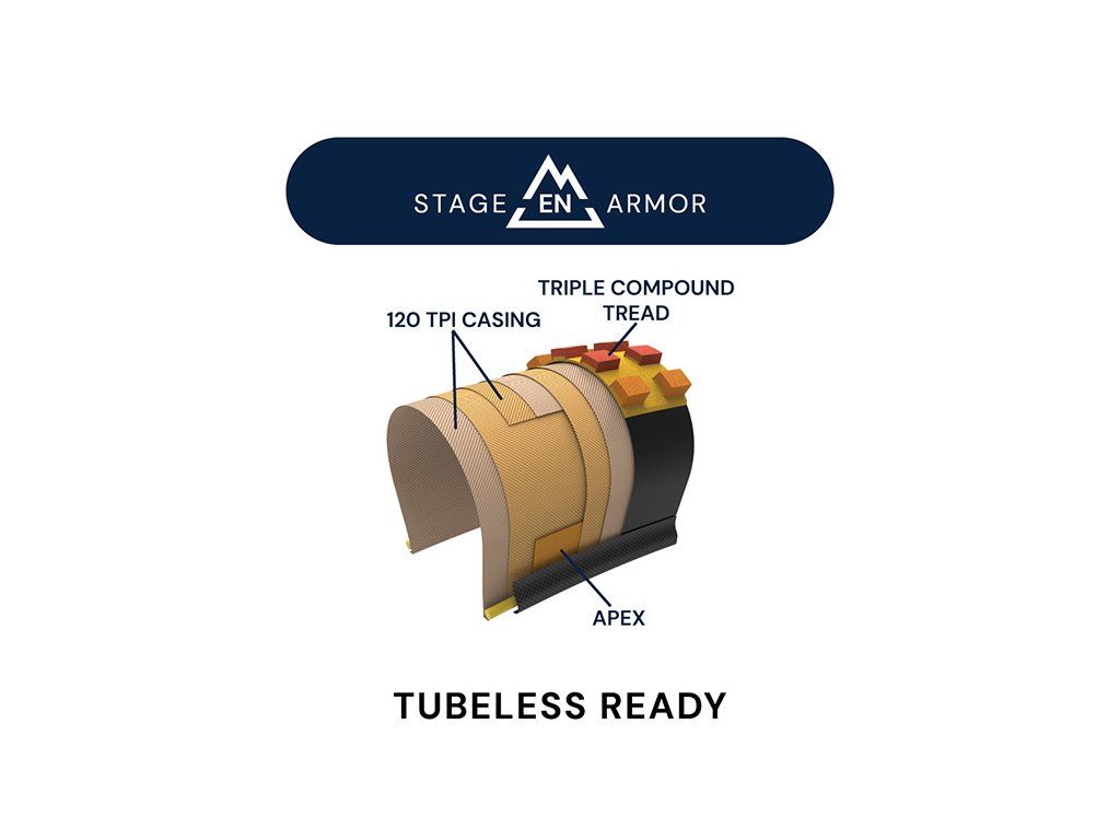 Přední specifická pneumatika Tectonite spoléhá na směrový dezén, který zahrnuje zkosené středové výstupky, šikmé ramenní výstupky a střídající se přechodové výstupky, které poskytují mnoho úhlů trakce pro konzistentní a spolehlivé zatáčení bez ohledu na to, jak moc se do zatáčky tlačíte. Pro dosažení optimálního výkonu spárujte pneumatiku Tectonite s pneumatikou Basanite na zadním kole. Plášť Tectonite je k dispozici ve verzi Enduro. Modely Enduro jsou vybaveny naší konstrukcí Stage EN Armor pro pneumatiky, které poskytují přilnavost v zatáčkách, jistotu při překonávání překážek a schopnost vyjet zpět na trail. Konstrukce Stage EN Armor je připravena pro bezdušové pláště.